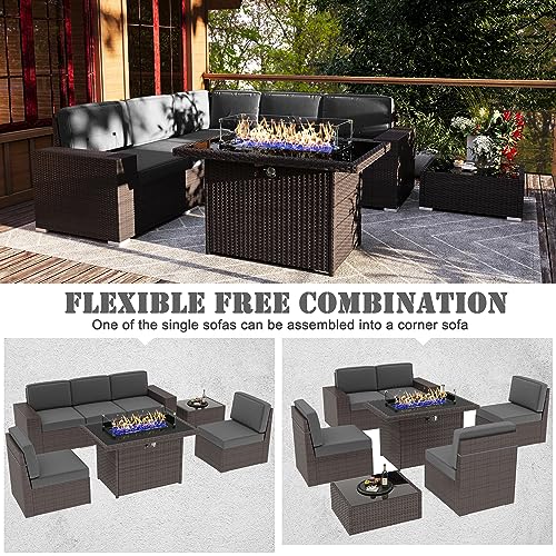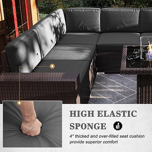 8 Pieces Patio Furniture Set with 44" Propane Gas Fire Pit Table, Outdoor Sectional Brown Rattan Wicker Conversation Sofa Sets with Coffee Table
