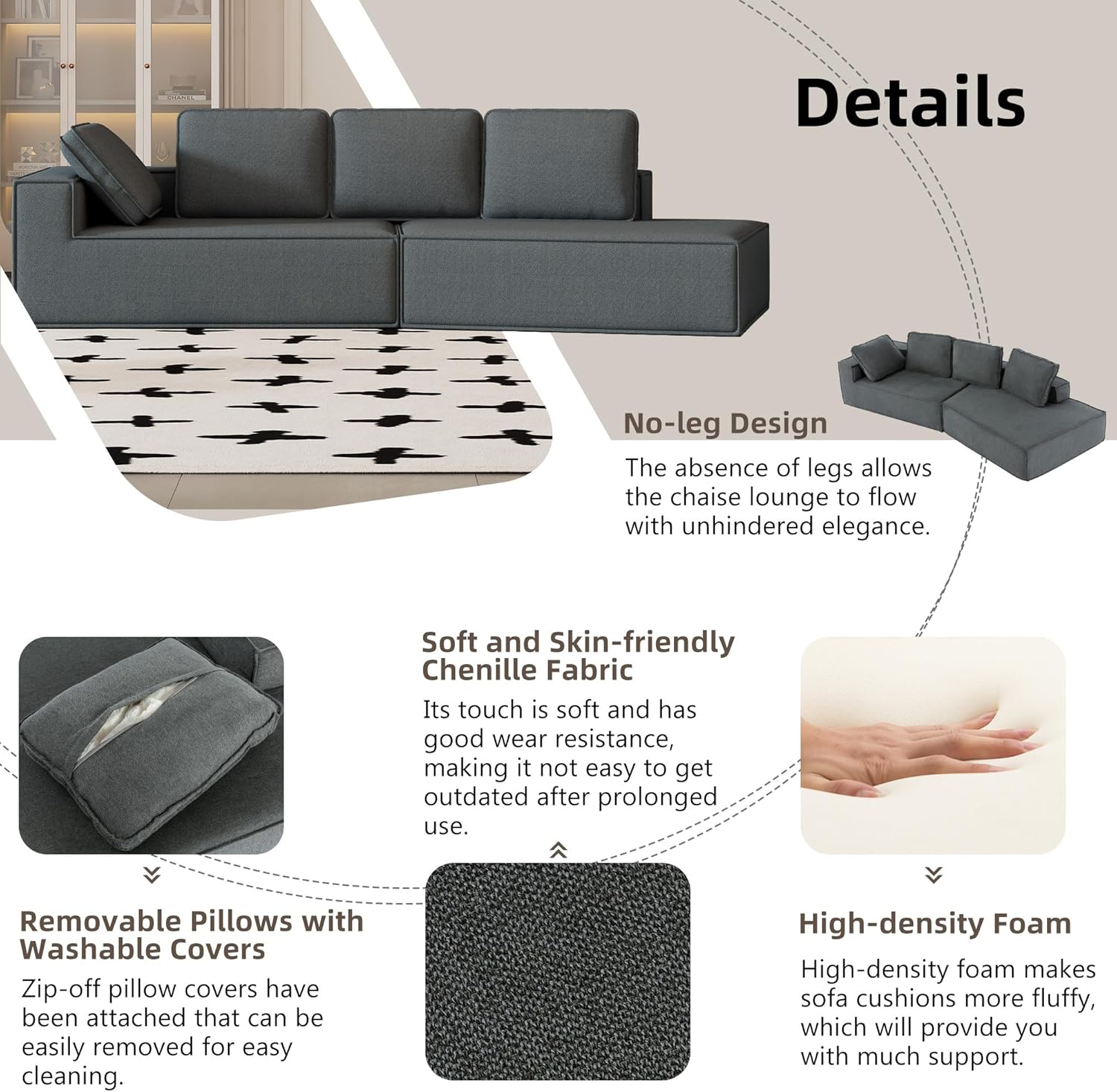 125" Stylish Chaise Lounge Modern Indoor Lounge Sofa Sleeper Sofa with Clean Lines for Living Room, Grey