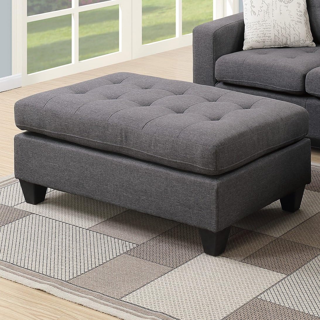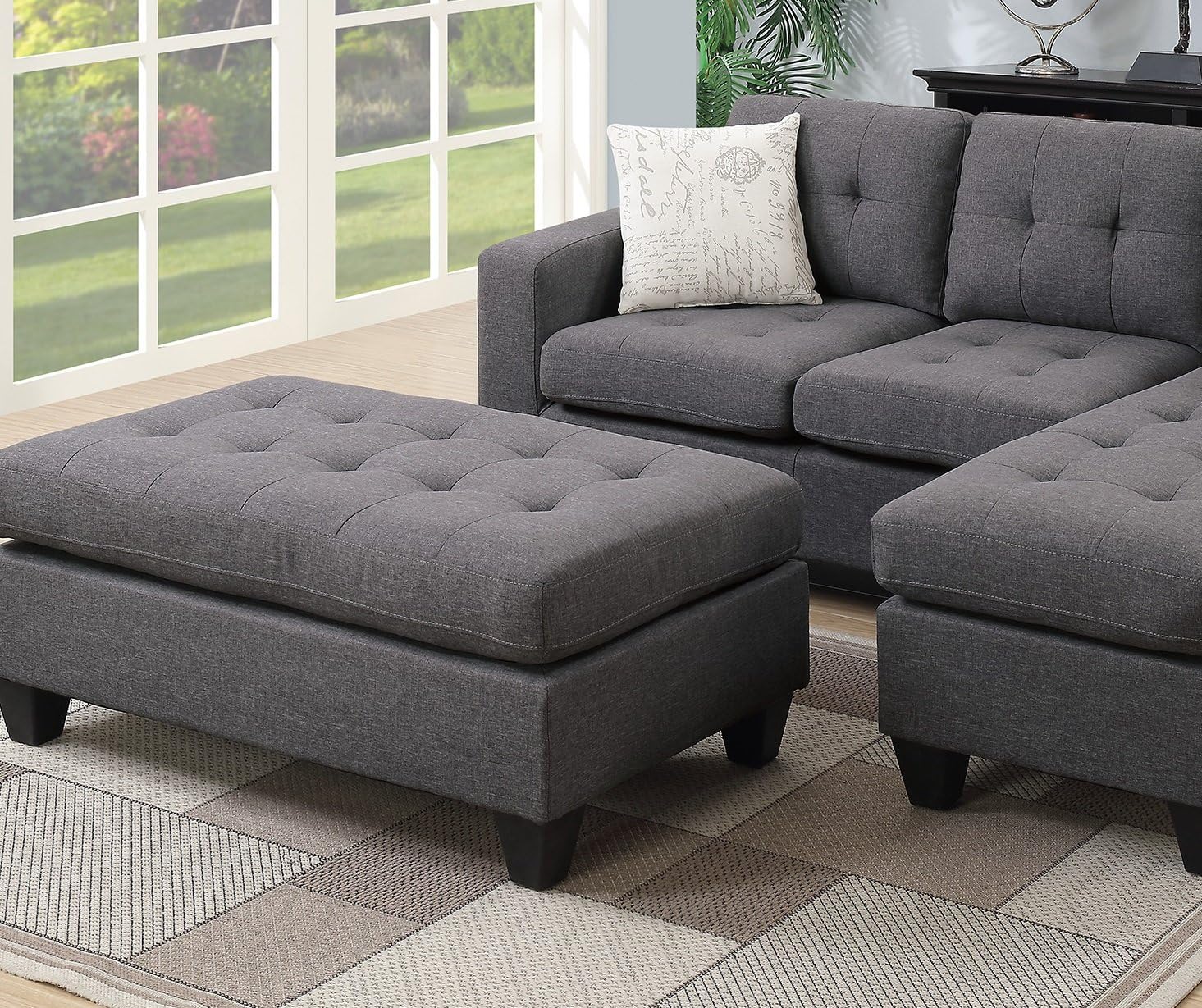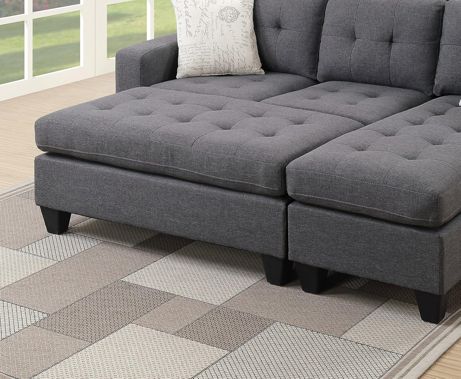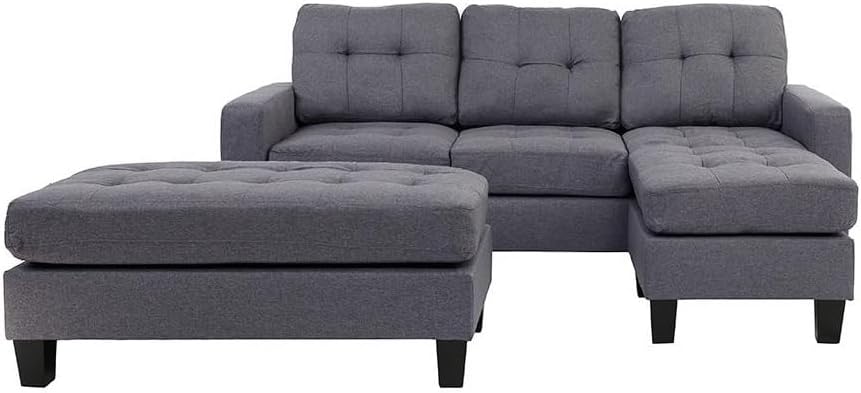 Blue Grey Polyfiber Linen Like Fabric 3pcs Reversible Sectional Sofa Chaise w Ottoman Chaise Tufted Couch Lounge Living Room Furniture