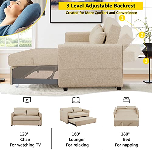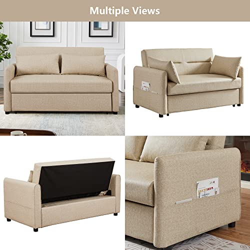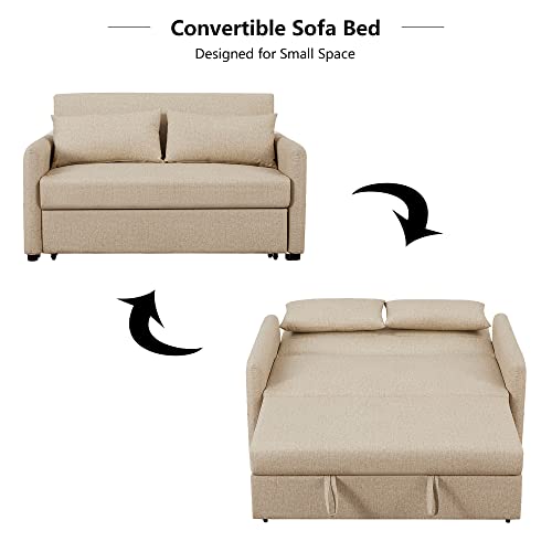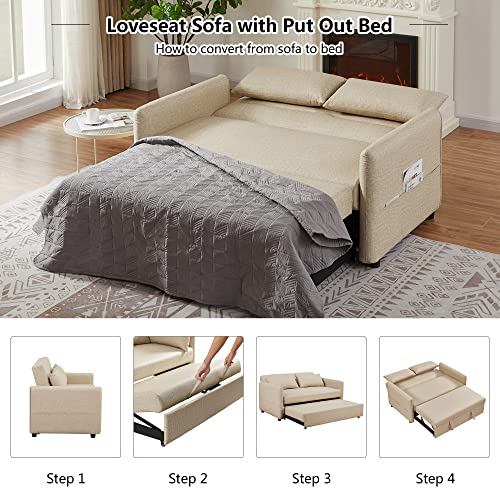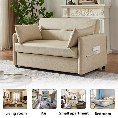 57" Convertible Sleeper Sofa Bed, 3 in 1 Faux Leather Loveseat Sofa with Put Out Bed, Modern 2 Seats Couch with Adjustable Back, 2 Pillows Side Pocket for Living Room Office RV, Yellow