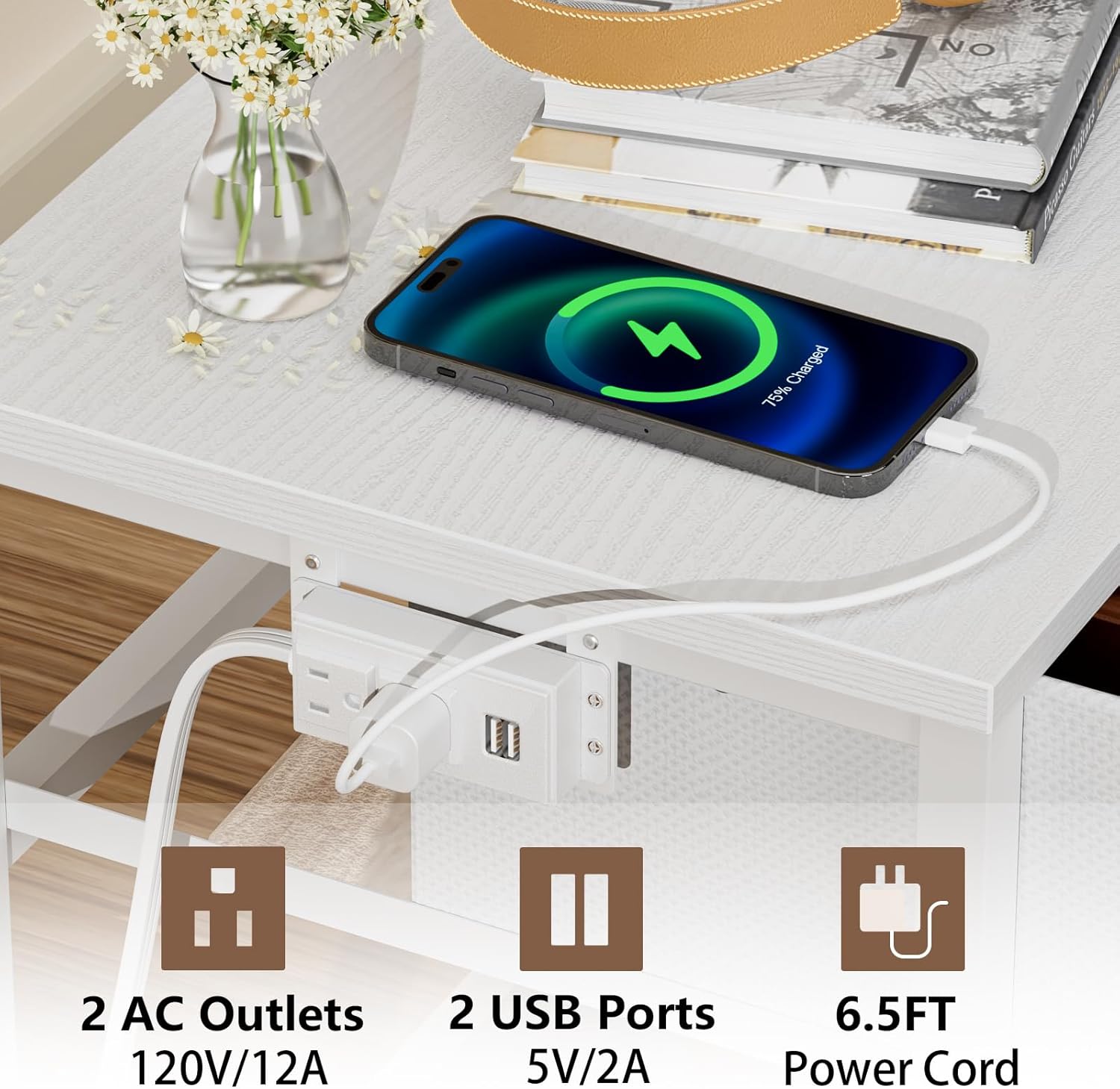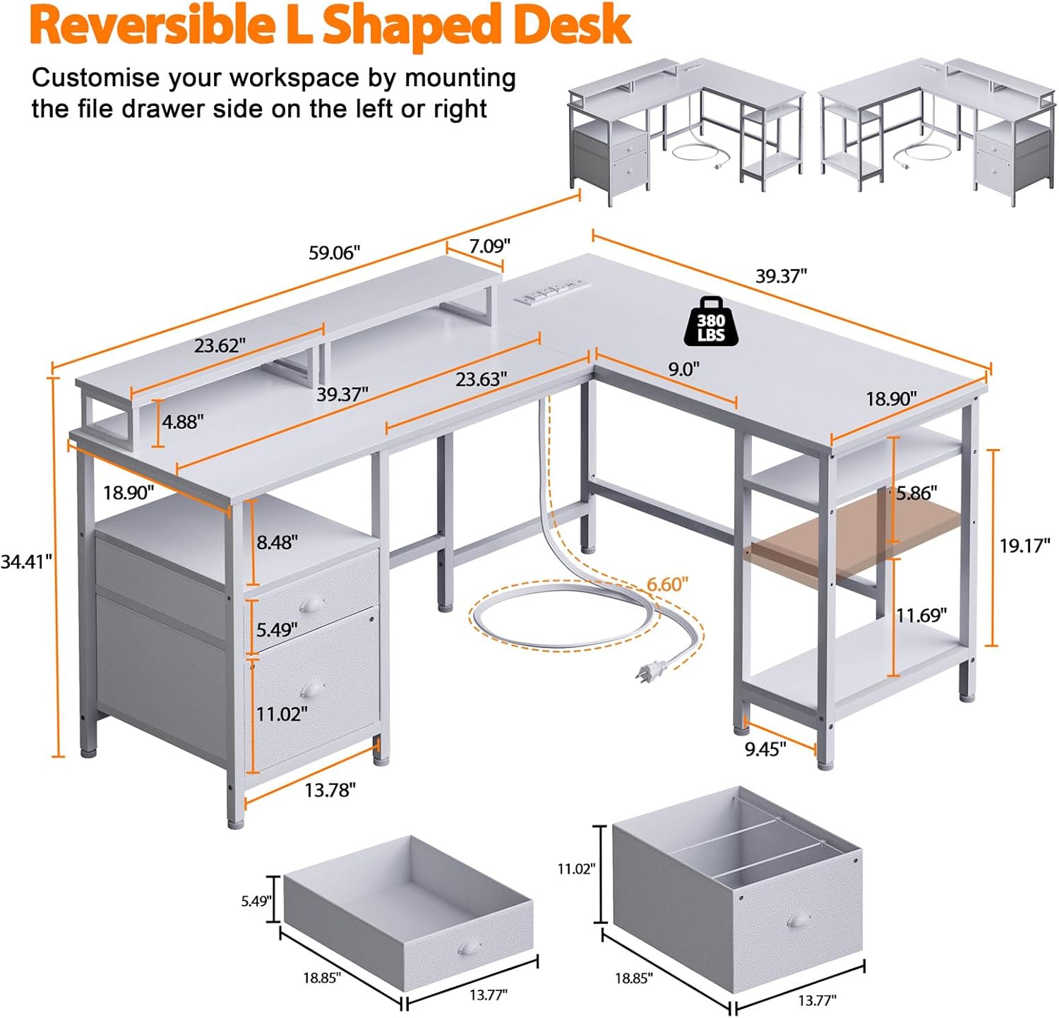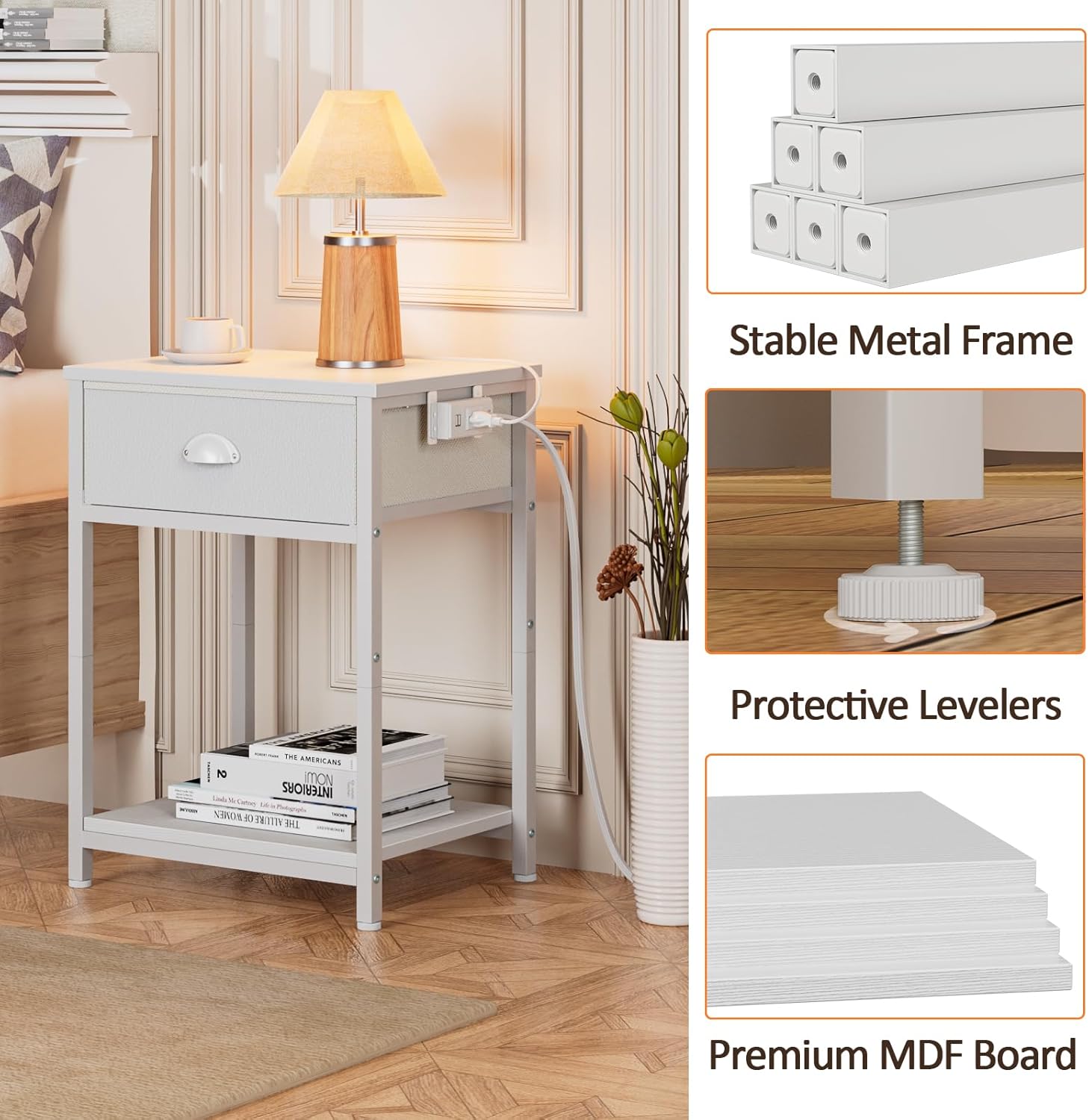 Furologee White 59” L Shaped Desk and Nightstands Set of 2, Small Bed Side Table with Fabric Drawer for Small Spaces,e for Living Room, Bedroom, Dorm