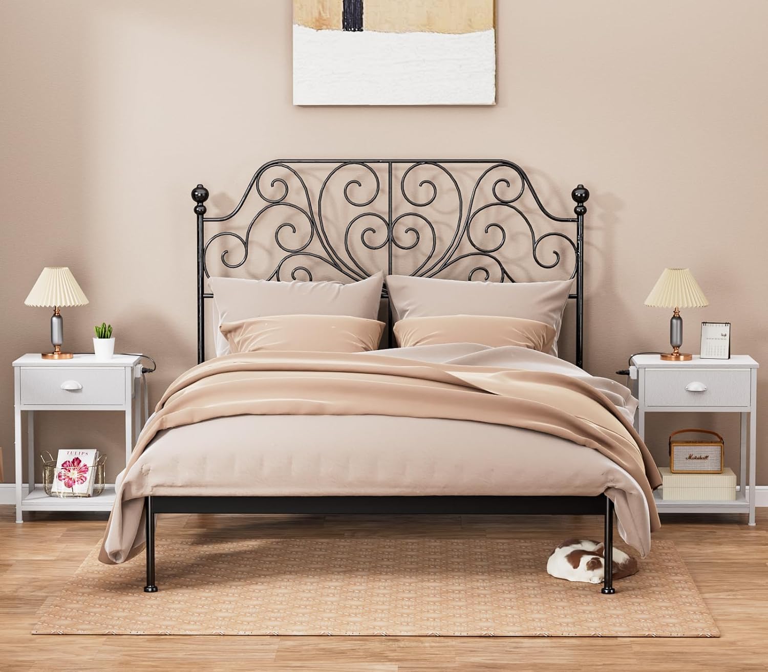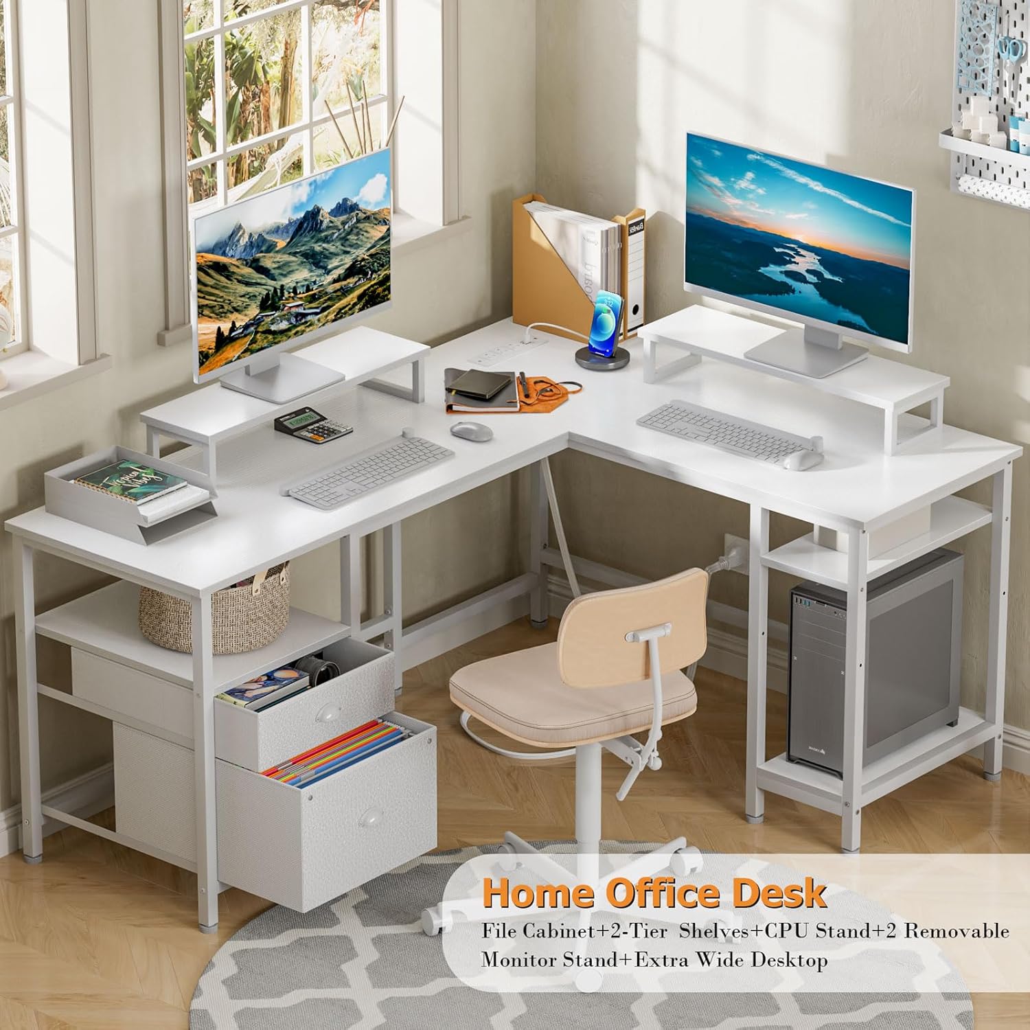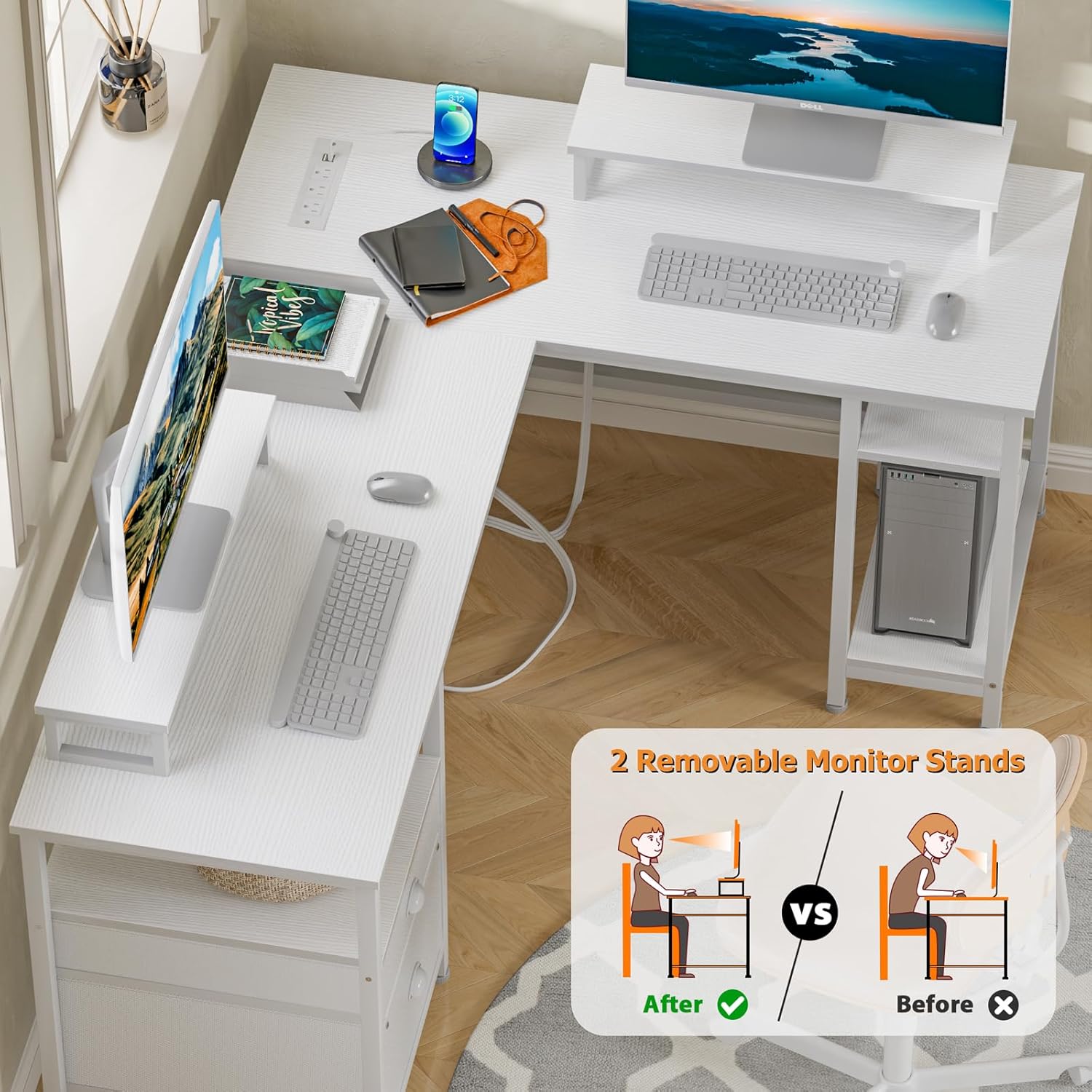 Furologee White 59” L Shaped Desk and Nightstands Set of 2, Small Bed Side Table with Fabric Drawer for Small Spaces,e for Living Room, Bedroom, Dorm
