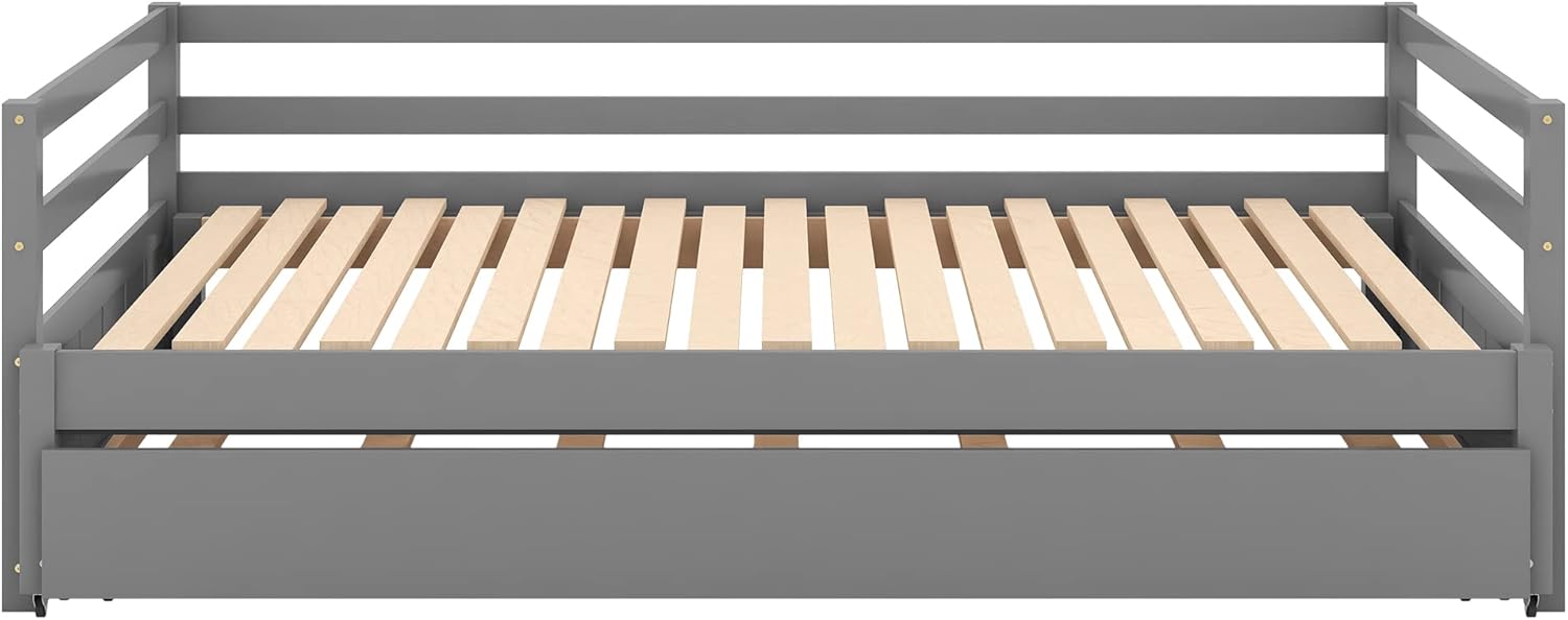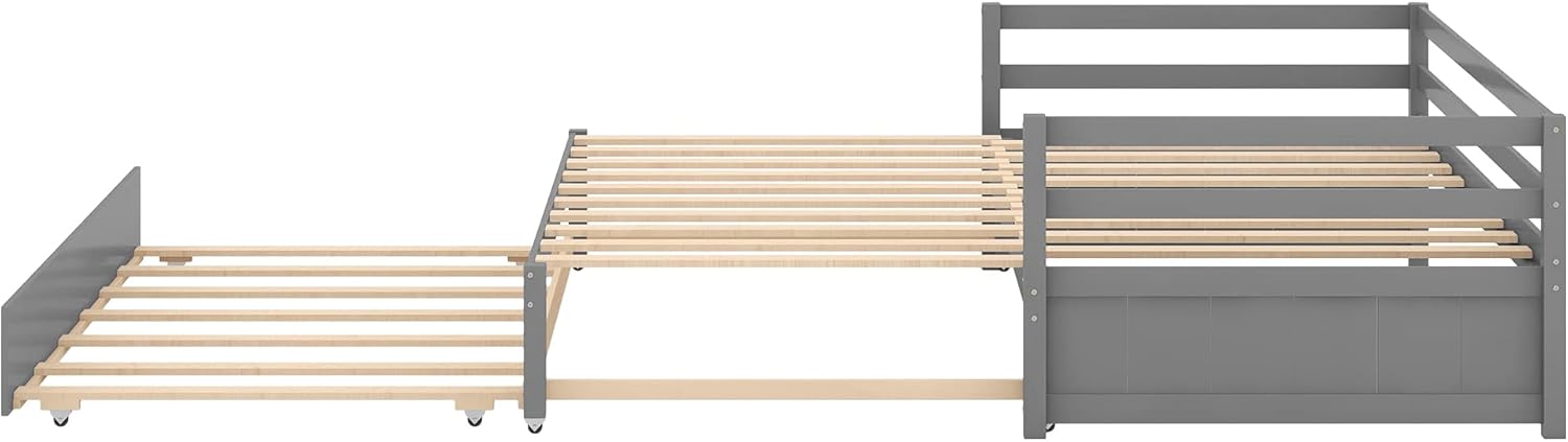 Extendable Wooden Daybed Frame, Twin or Double Twin Daybed with Pulled Out Trundle w/Wheels, Day Bed Sofa Bed for Living Room Bedroom Guestroom, Easy Assembly, Gray