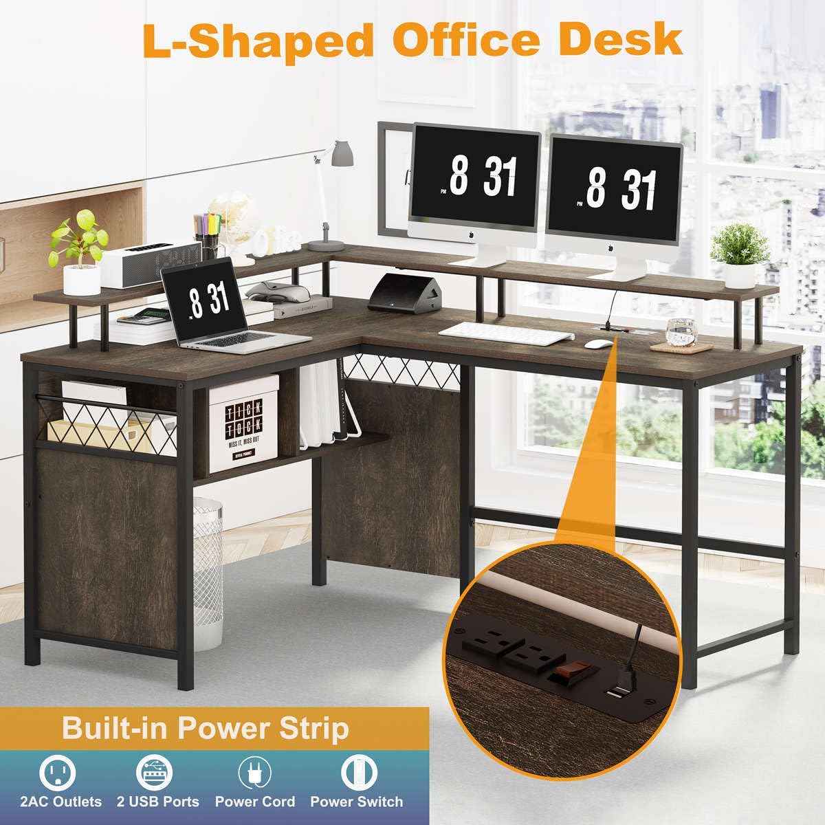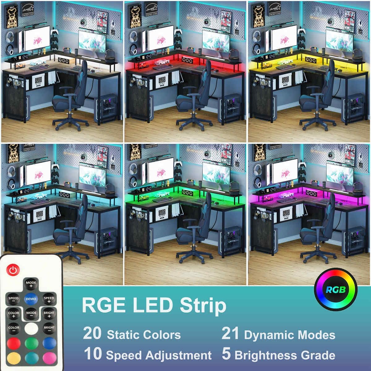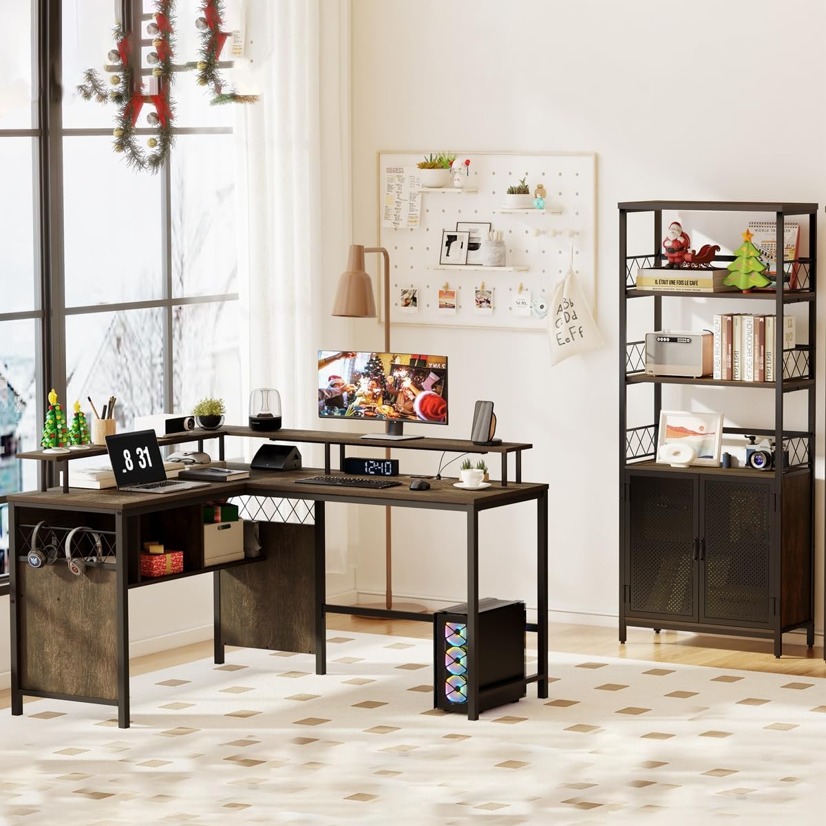 Bookshelf with Doors and L Shaped Computer Desk Set, Bookcase with Doors and Reversible L Desk with Power Outlets and LED Lights, Book Shelf and Home Office Desks with Storage (Walnut Brown)