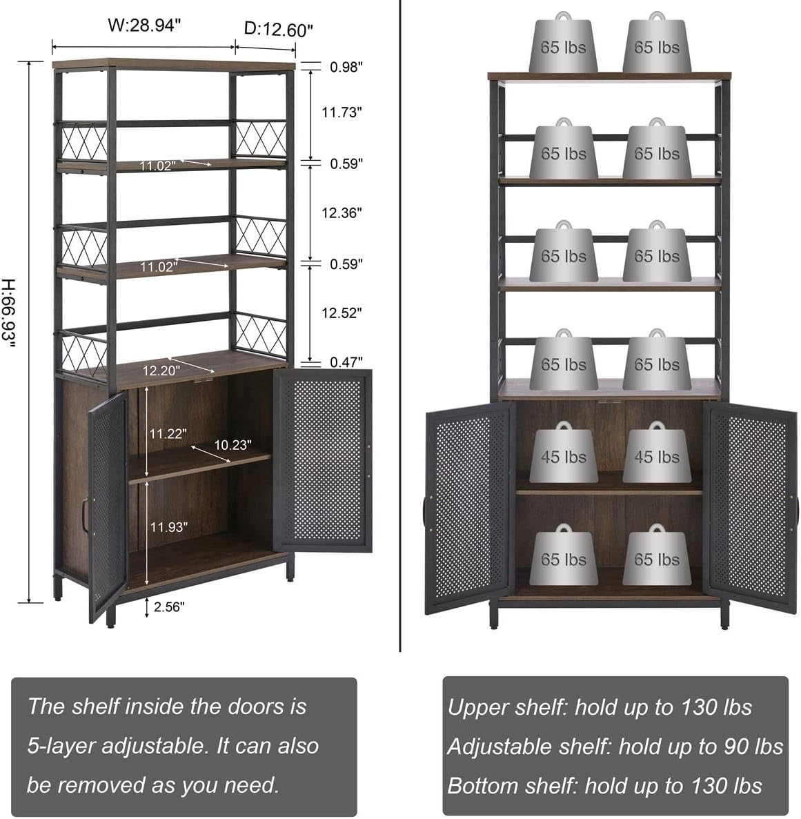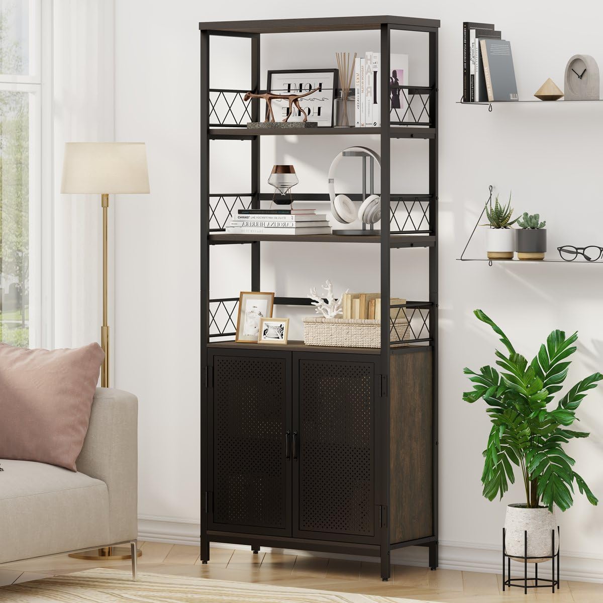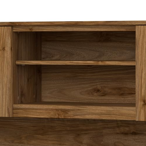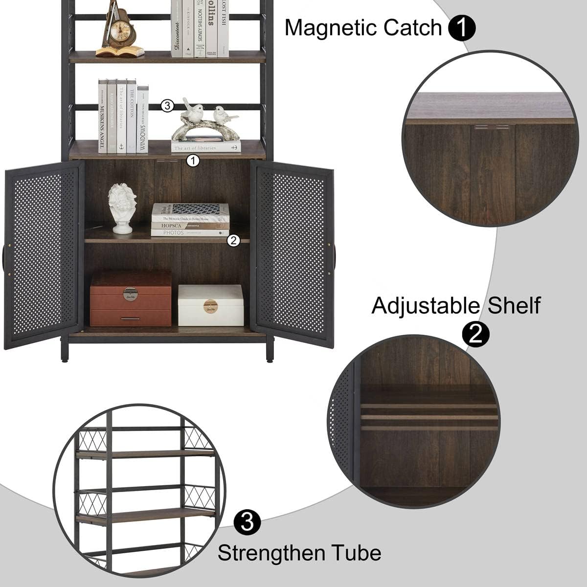 Bookshelf with Doors and L Shaped Computer Desk Set, Bookcase with Doors and Reversible L Desk with Power Outlets and LED Lights, Book Shelf and Home Office Desks with Storage (Walnut Brown)