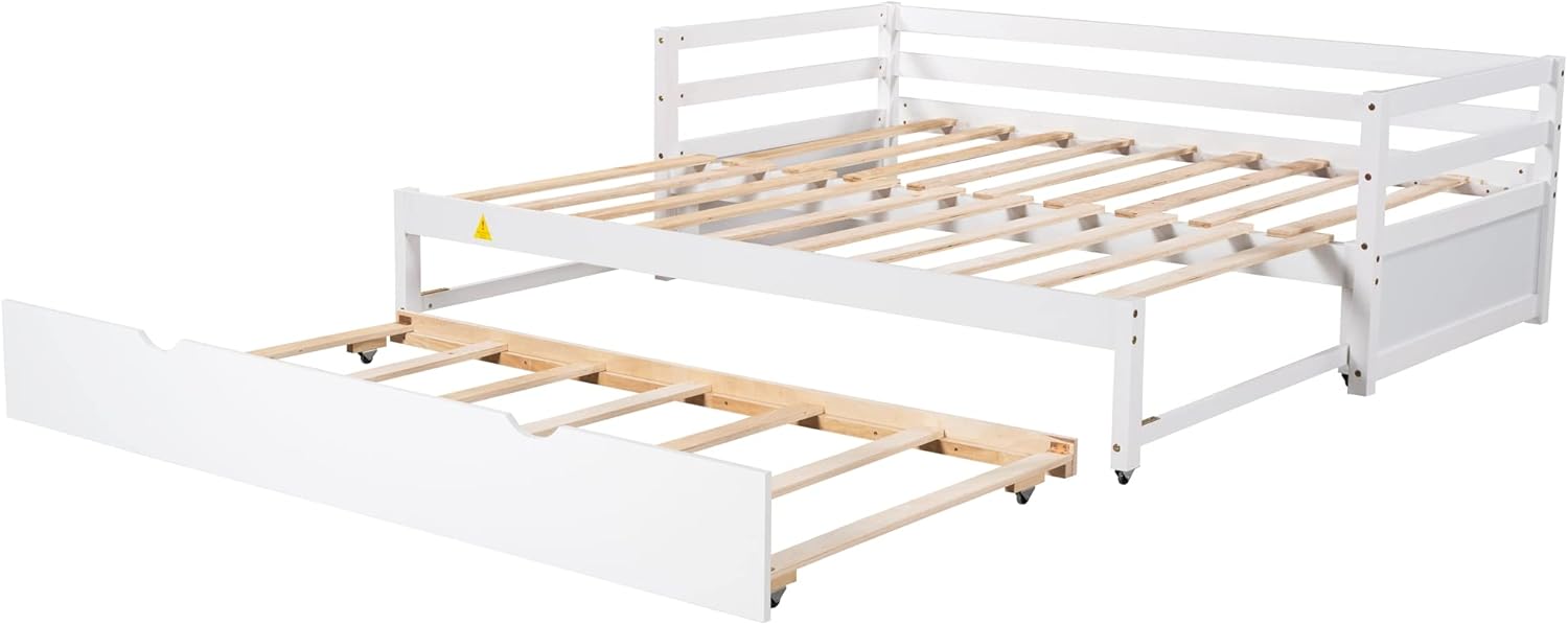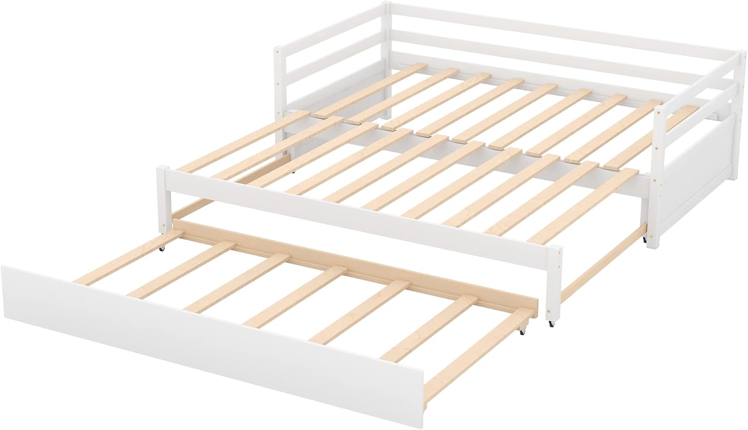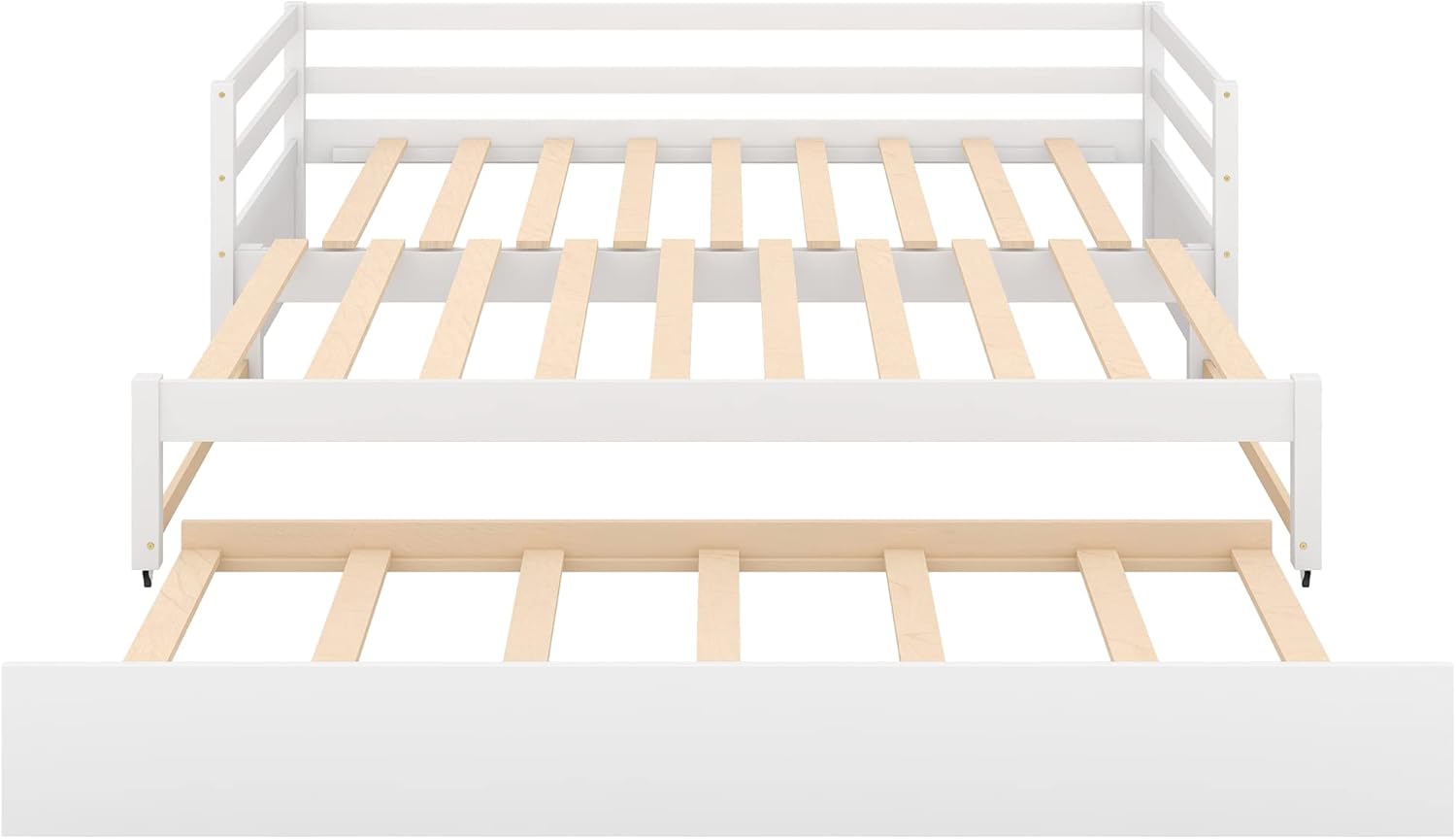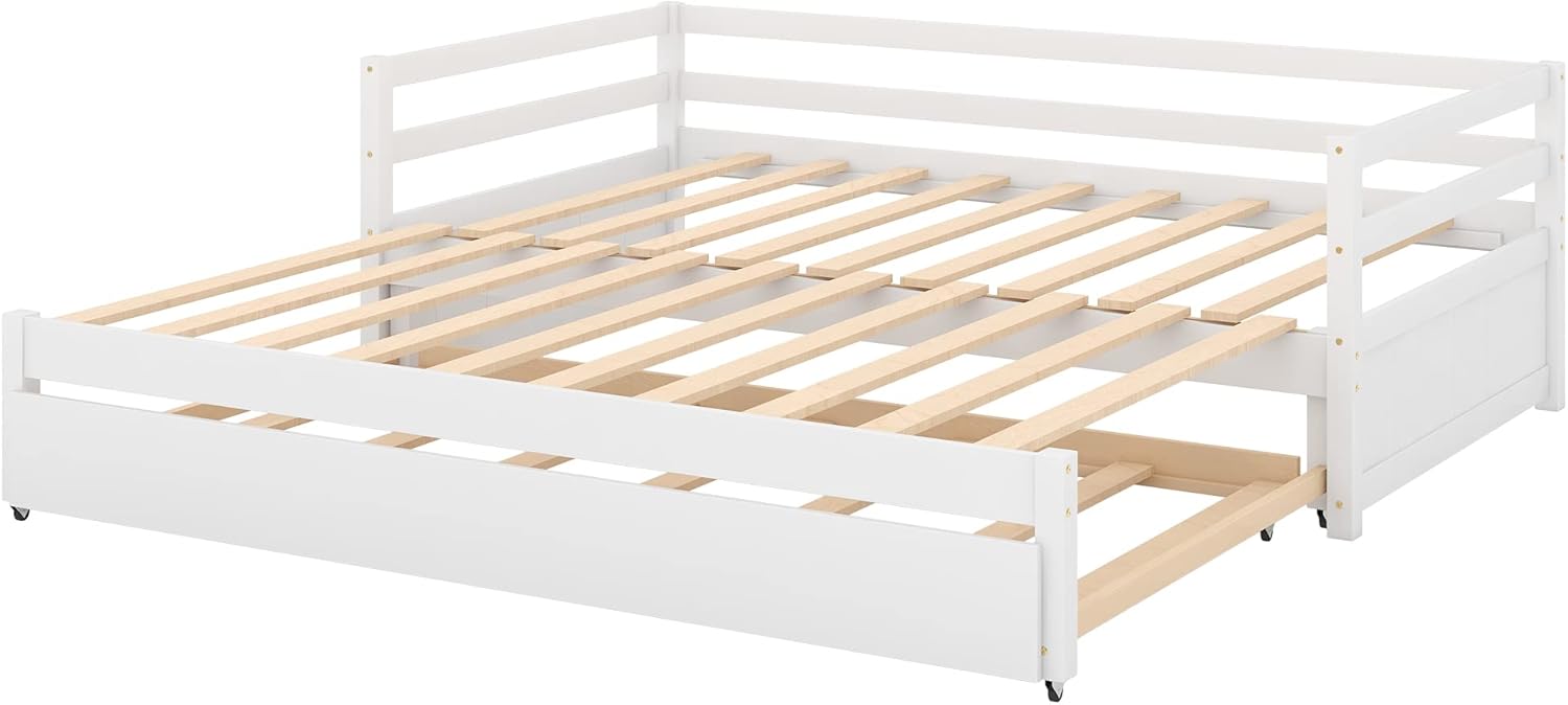 Twin Extendable Daybed with Trundle, Twin to King Bed with Pull out Trundle, Twin or Double Twin Sofa Bed for Bedroom Living Room Guest Room, White