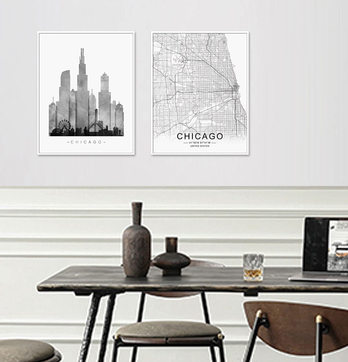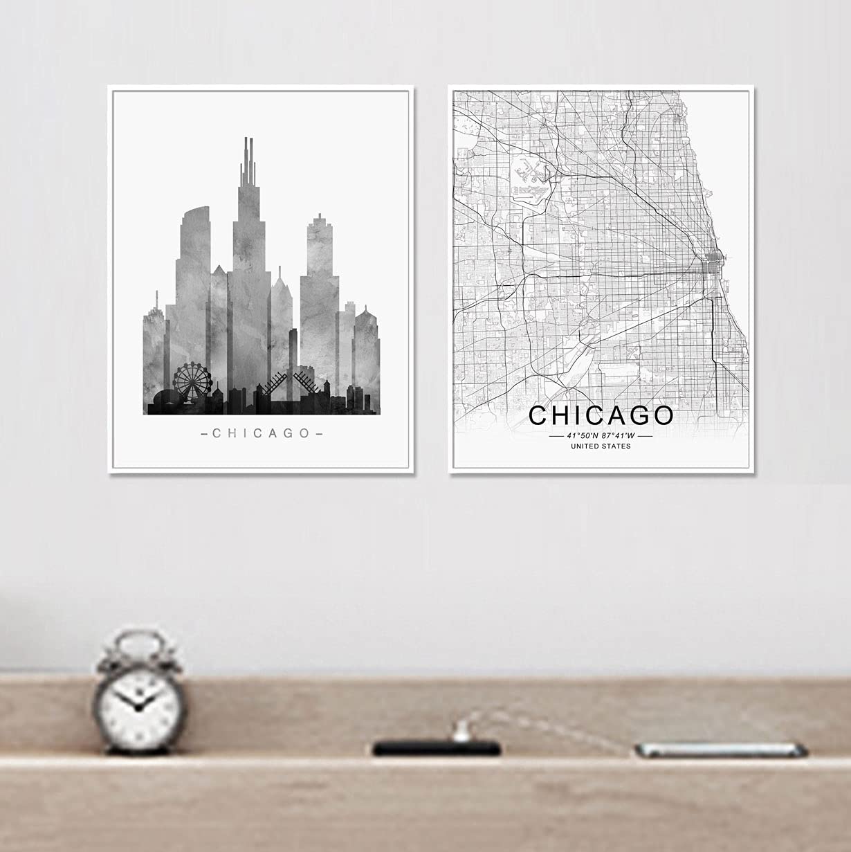 Chicago Skyline, Chicago Wall Art, Chicago Street Map, Watercolor Skyline Print, Building Wall Decor, Office Wall Art, Map Print, Set of 2 Prints, 11X14 Inch Unframed