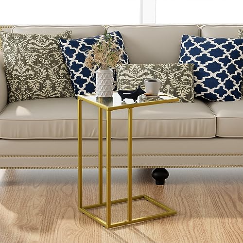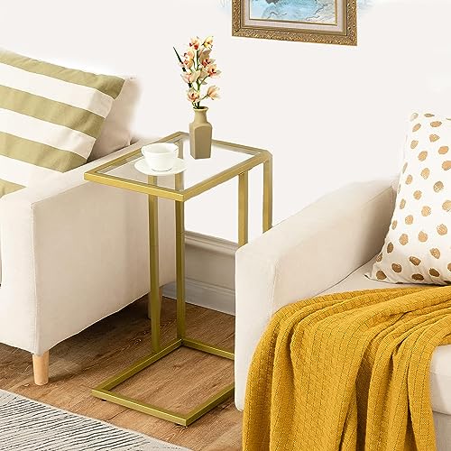 C Shaped End Side Table Set of 2,Couch Sofa Table for Small Space,Tempered Glass Snack Side Table with Metal Frame for Living Room, Bedroom, Bedside, Modern Style, Gold