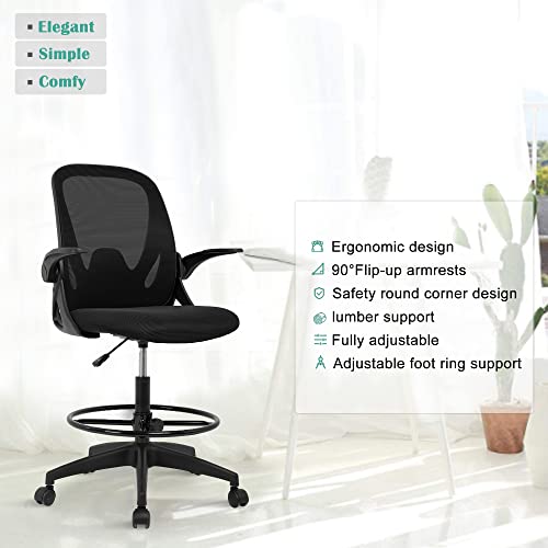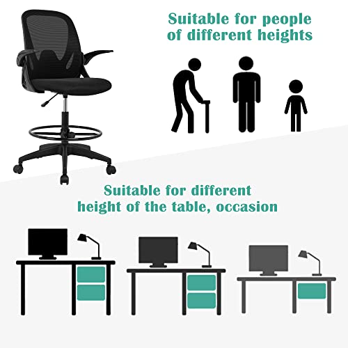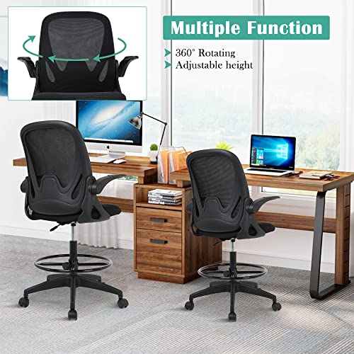 Drafting Chair Tall Office Chair Mid-Back Breathable Mesh Executive Task Desk Chair 360° Swivel Rolling Ergonomic 48" High Adjustable Computer Chair w/Lumbar Support Foot Ring & Flip-Up Arms (Black)