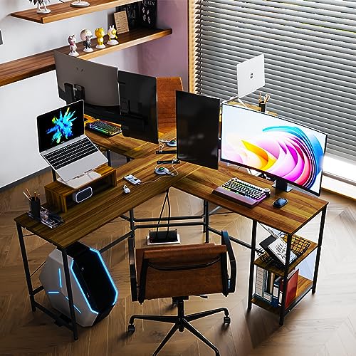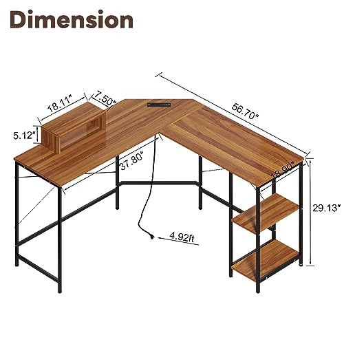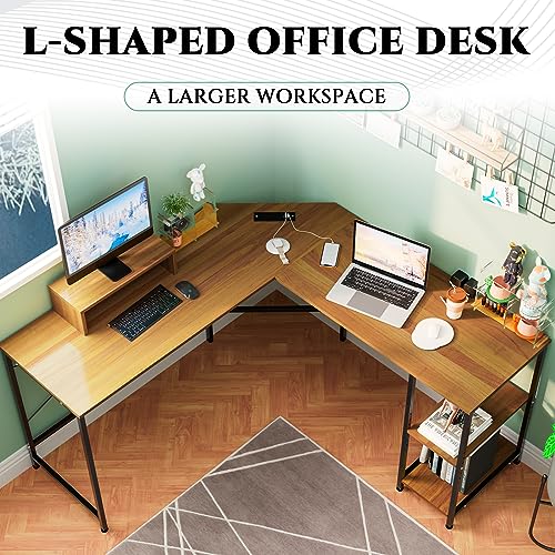 Maxtown L Shaped Desk with Power Outlets, Large Computer Desk with Monitor Stand & Storage Shelves, Home Office Desk Corner Desk Gaming Desk, Teak
