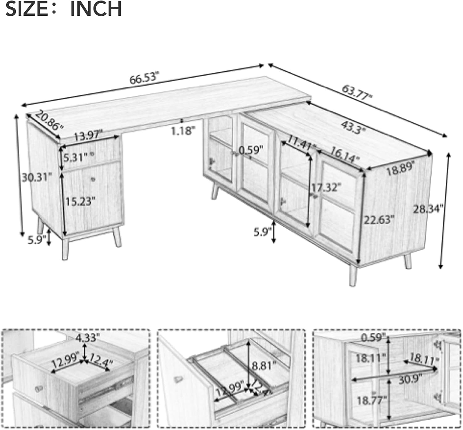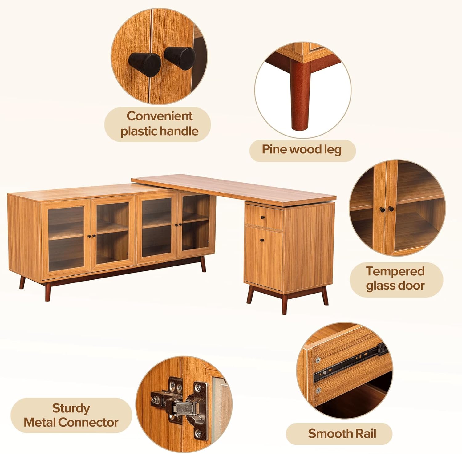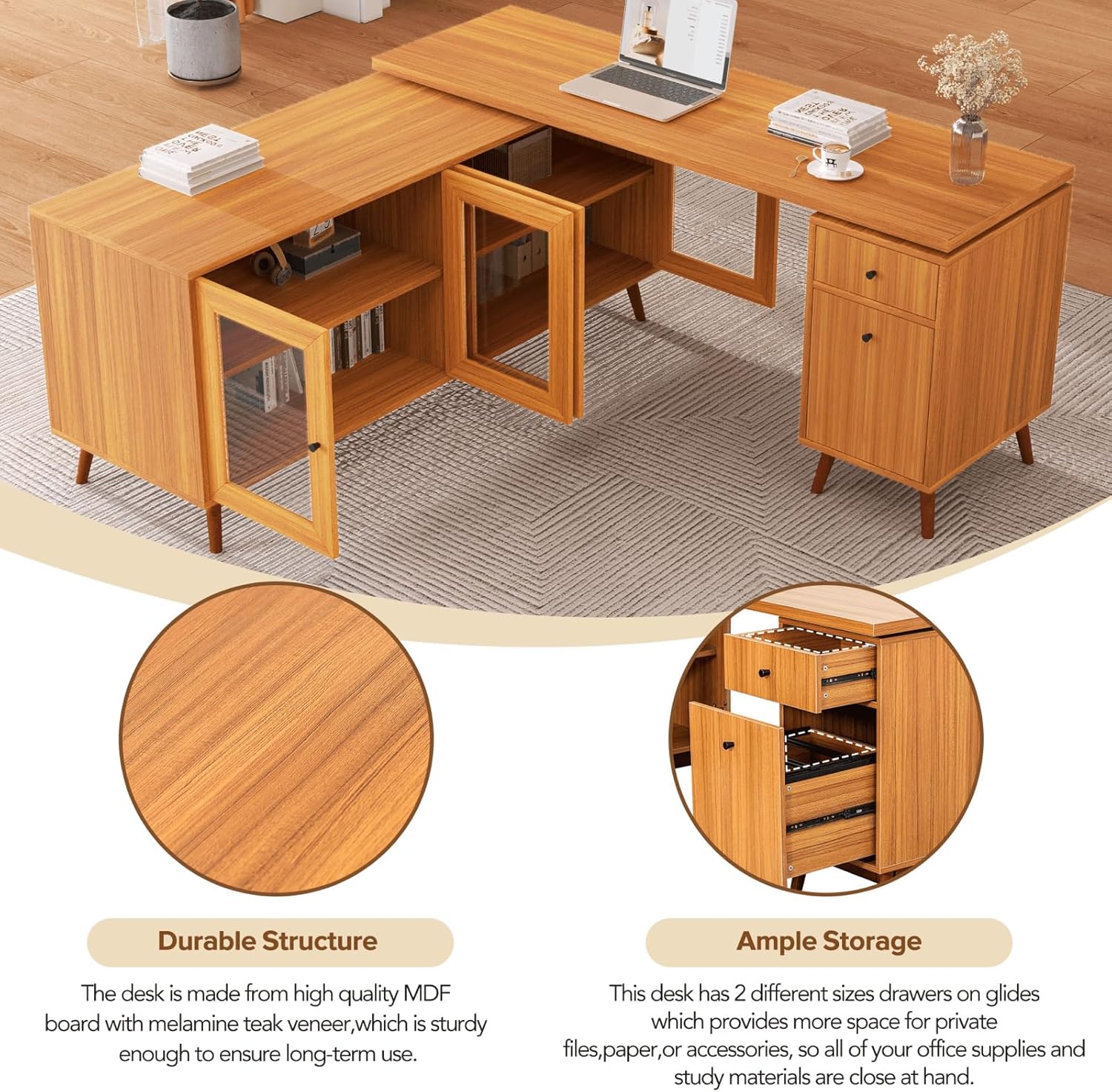 66.5" Modern L-shaped Executive Desk with delicate tempered glass Cabinet Storage,Large Office Desk with Drawers,Business Furniture Desk Workstation for Home Office,Teak