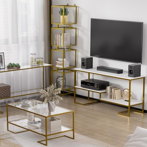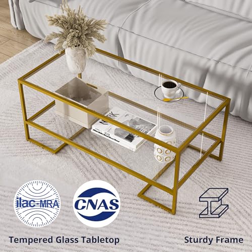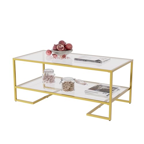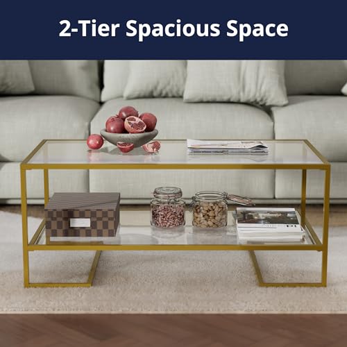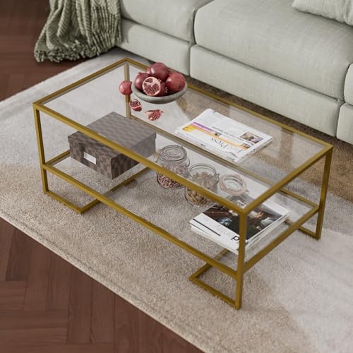 Cozy Castle Gold Coffee Table with Metal Frame, Rectangle Tempered Glass Coffee Table, 2-Tier Center Tea Table with Storage Shelf, Modern Centre Table for Living Room