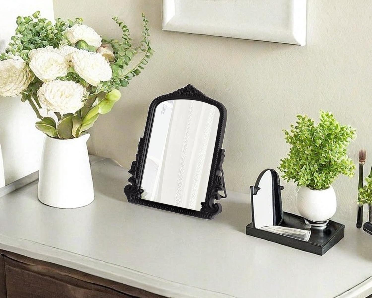 White Arched Vanity mirror with Wood Frame, Vintage Makeup Mirror Baroque Style Arendahl Carved Mirror for Desk Decorative Table Mirror Aesthetic for Dresser,Bedroom,Living-Room 11.8" x 9.6"