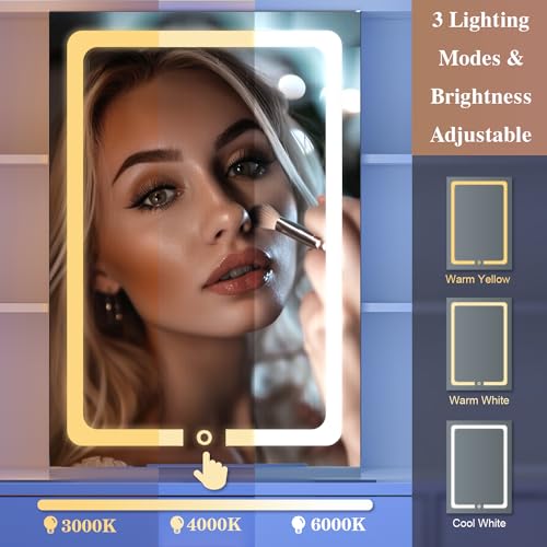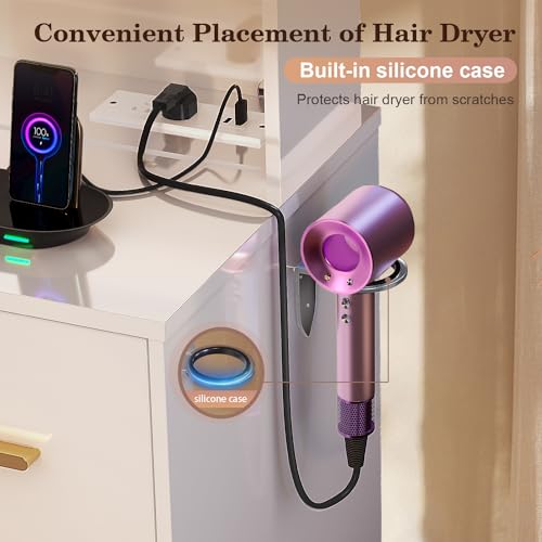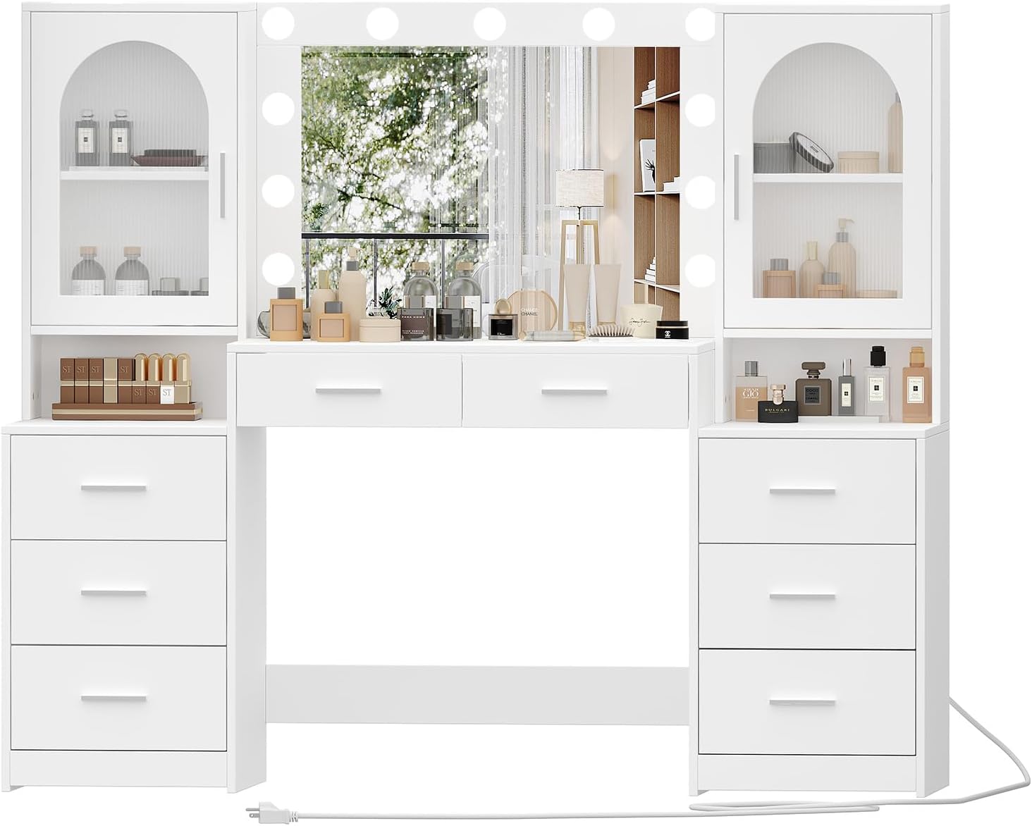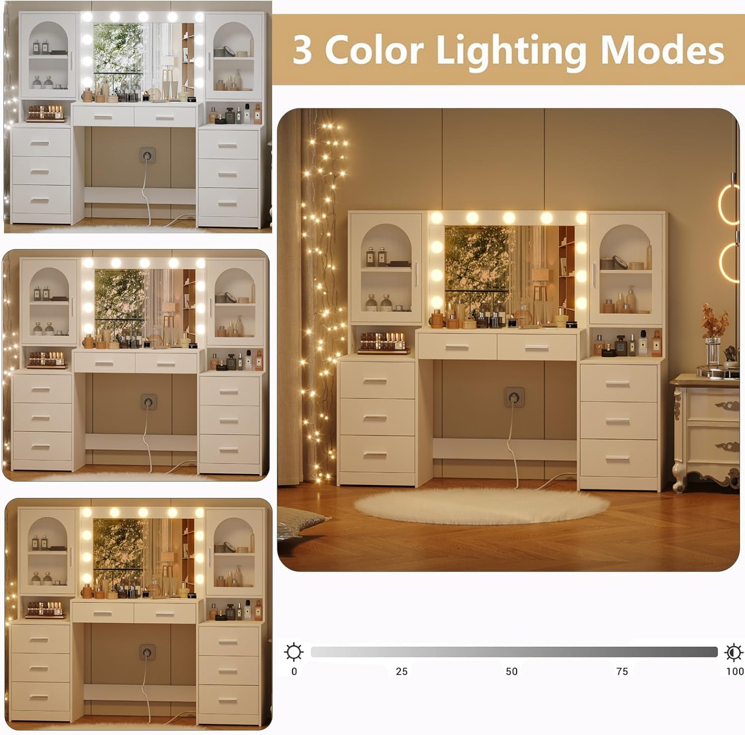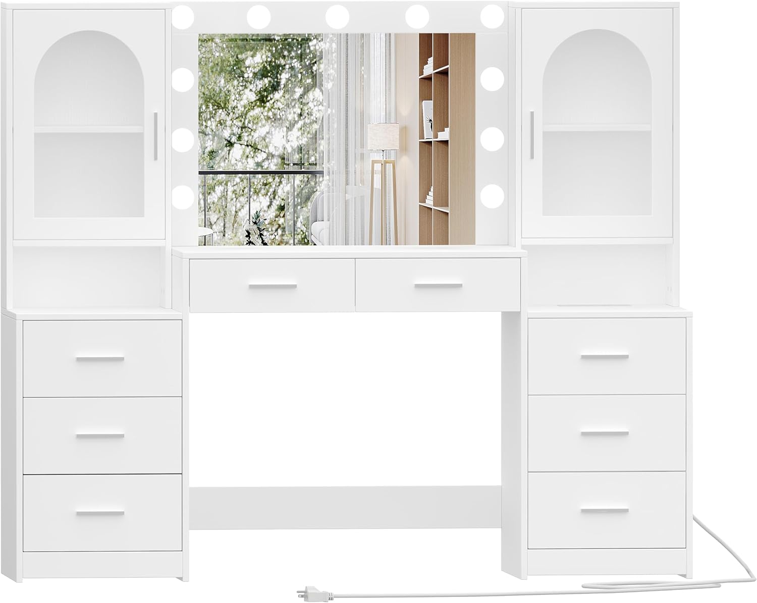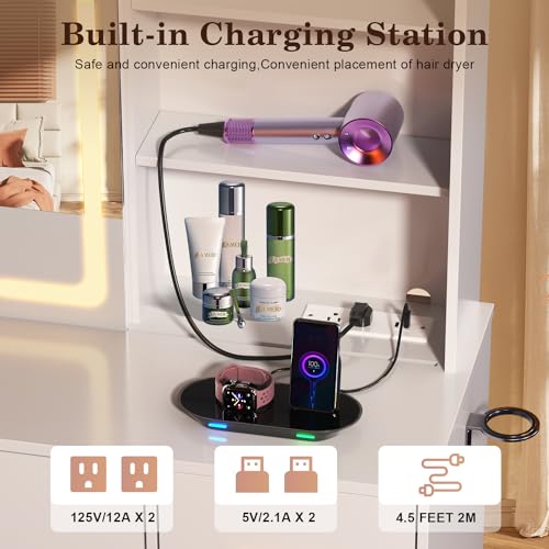 Rovaurx Large Vanity Desk with Mirror & Lights, Large Makeup Vanity Table with Charging Station, Bedroom Makeup Vanity with 8 Drawers and Side Cabinet, 3 LED Light Modes, White RSZT113W
