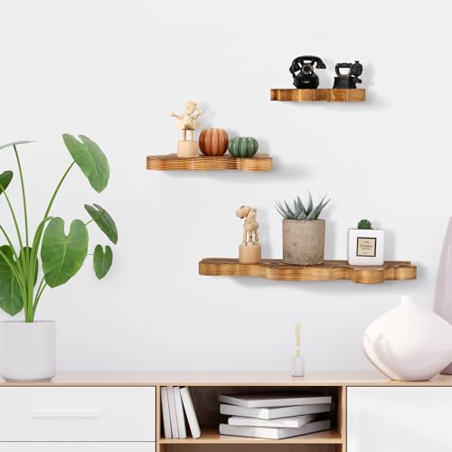 Set of 3 Small Rustic Wave Edge Floating Shelf 3 Size Live Edge Wooden Shelf with Metal Bracket Wall Mounted Display Ledge Shelves Farmhouse Vintage Wall Decor for Living Room Bedroom (Walnut)
