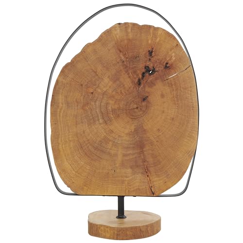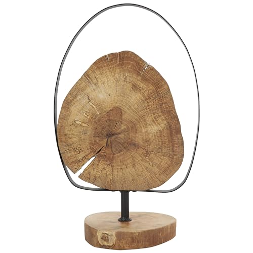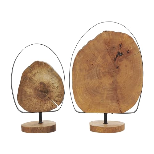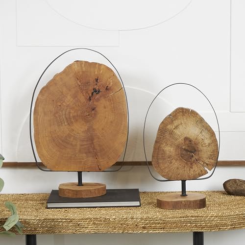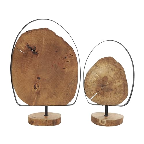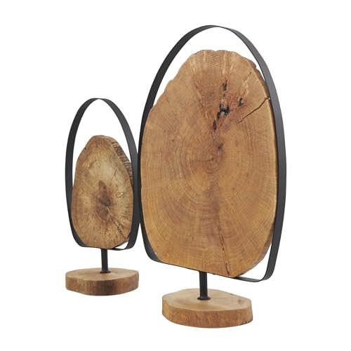 Deco 79 Wood Abstract Handmade Decorative Sculpture Live Edge Slab Home Decor Statues with Black Metal Rings, Set of 2 Accent Figurines 18", 15"H, Brown