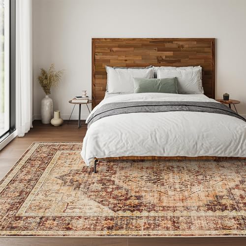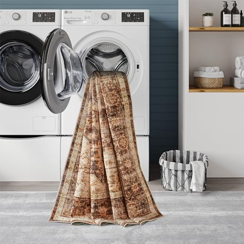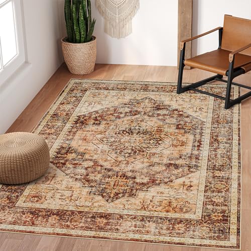 Art&Tuft Washable Rug 5x7, Area Rugs for Living Room, Anti Slip Low Pile Rug Floor Carpet, Vintage Tribal Stain Resistant 5x7 Rugs for Bedroom, Dining Room, Kitchen, Brown
