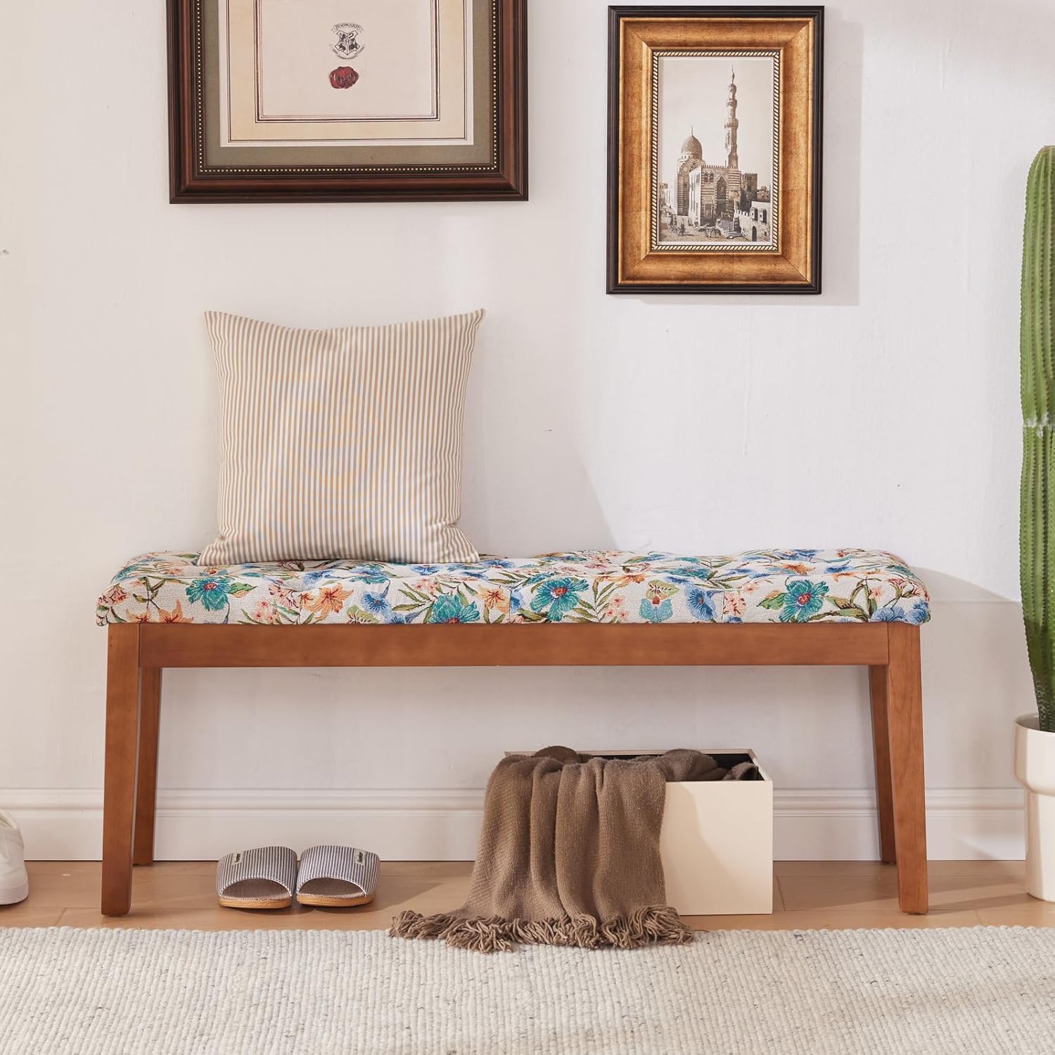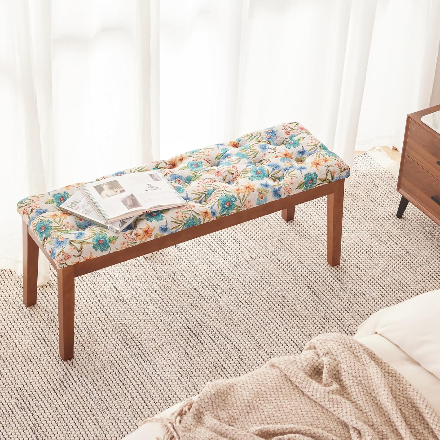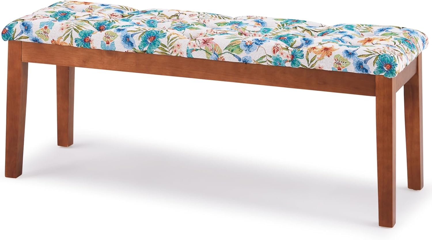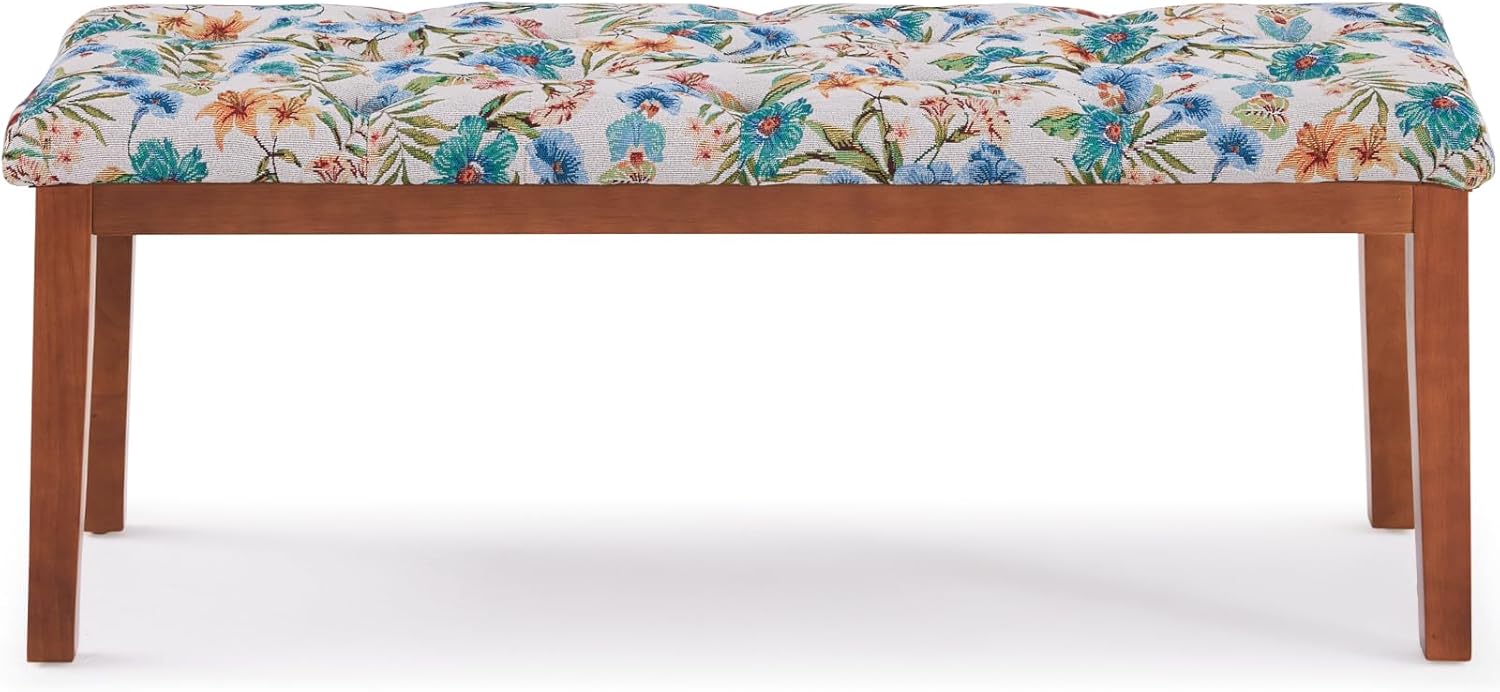 Entryway Bench, End of Bed Bedroom Bench, Dining Bench Ottoman with Solid Wood Legs, Upholstered Tufted Padding Seat for Living Room, Floral White