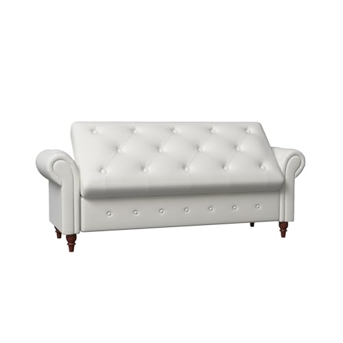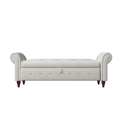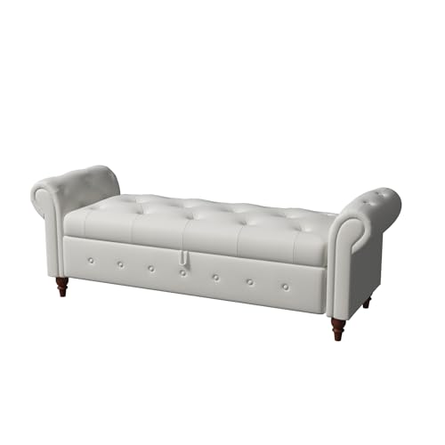 JINS&VICO 63" Storage Ottoman Bench, Button Tufted End of Bed Bench with Rolled Arms, Storage Bench with Solid Wood Legs, for Living Room, Bedroom, Entryway, Beige