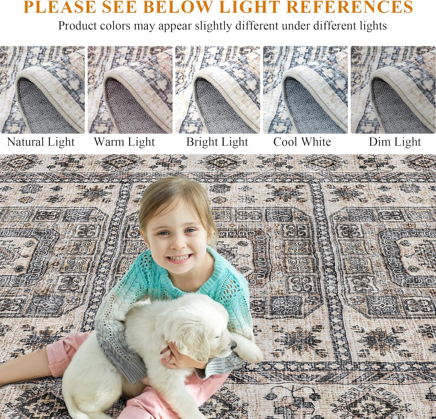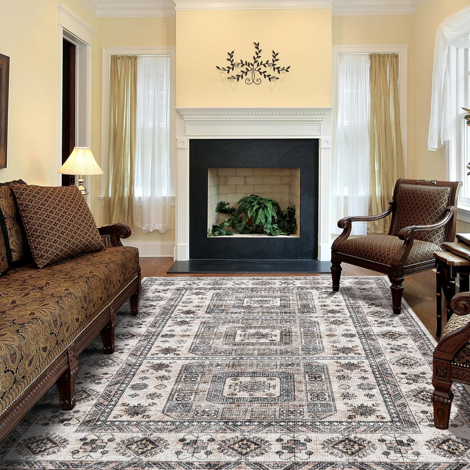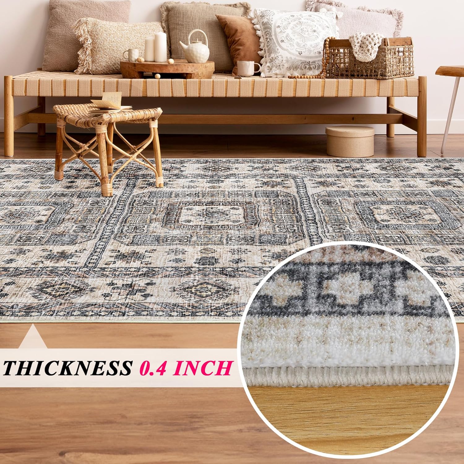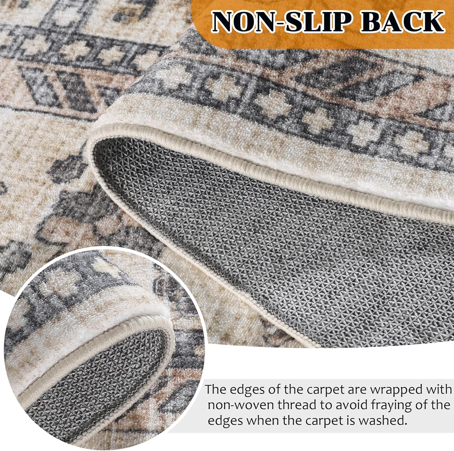 Vintage Washable Rug,8x10 Boho Area Rug for Living Room, Bedroom, Kitchen, Soft Non-Slip Foldable Indoor Rug, Sandy