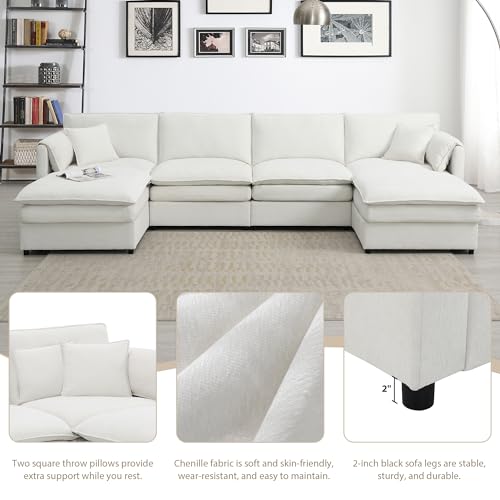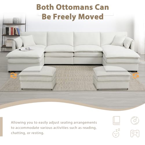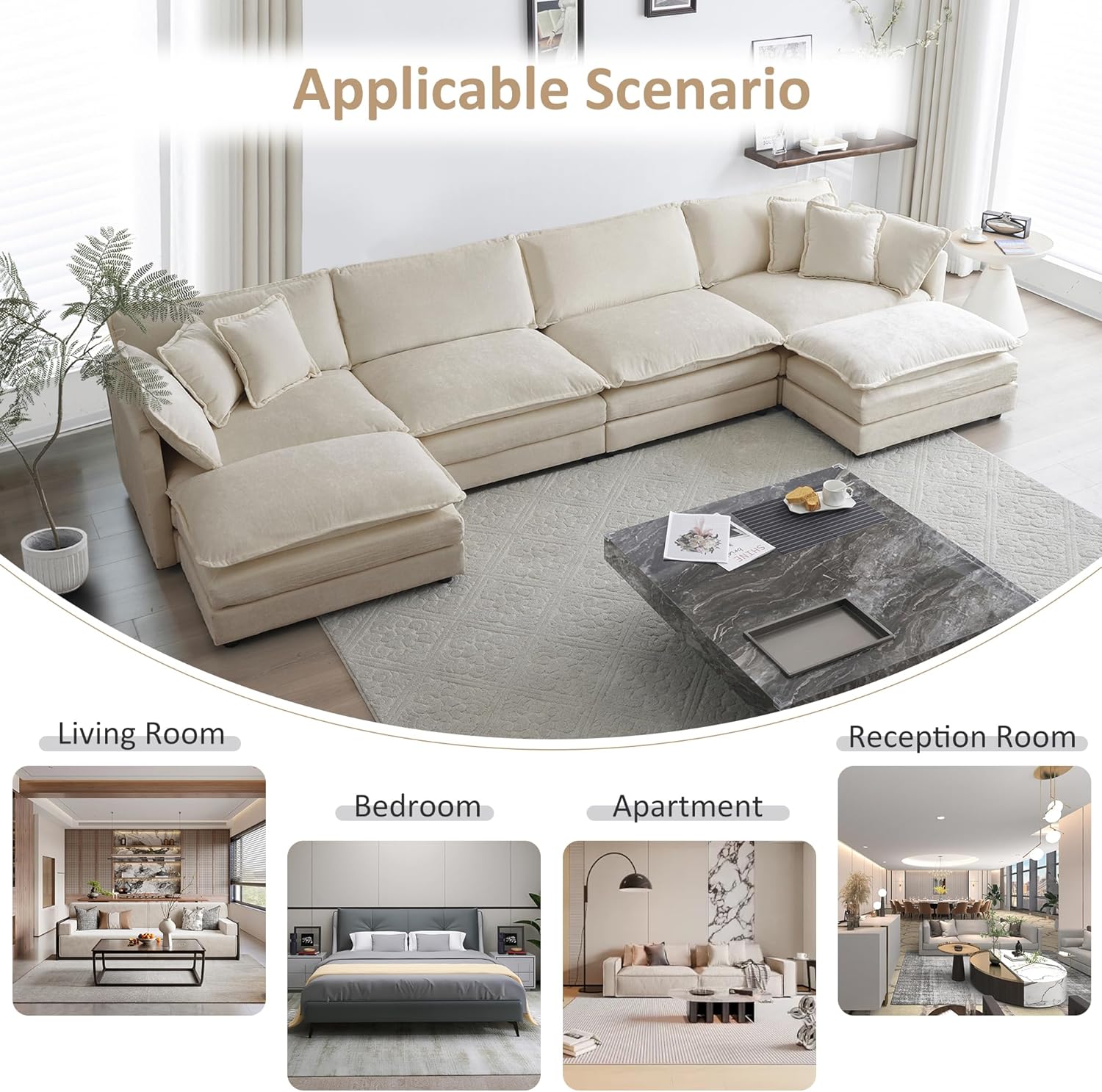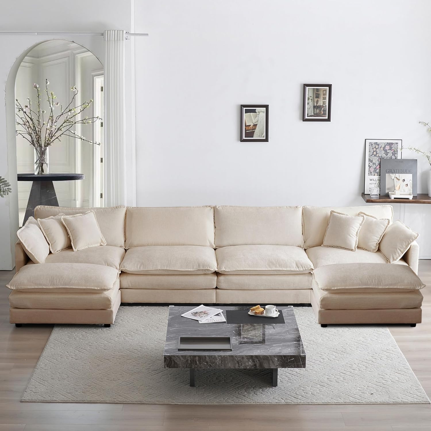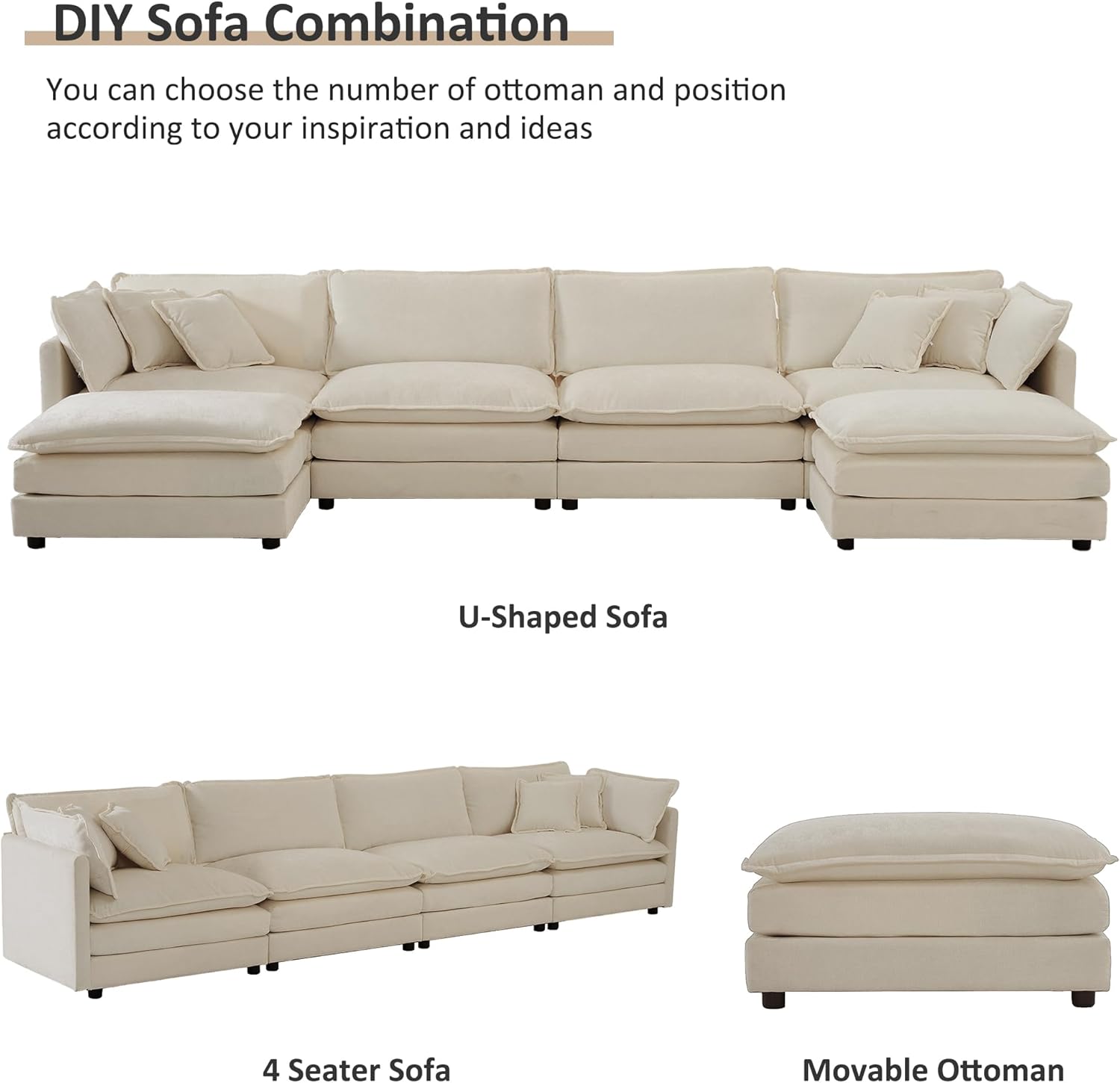 KIVENJAJA 134”W Oversized Cloud Couch Sectional, Chenille U Shaped Modular Sectional Sofa with 2 Ottomans & Pillows, 6 Seater Deep Seat Sleeper Living Room Furniture Set, Cream