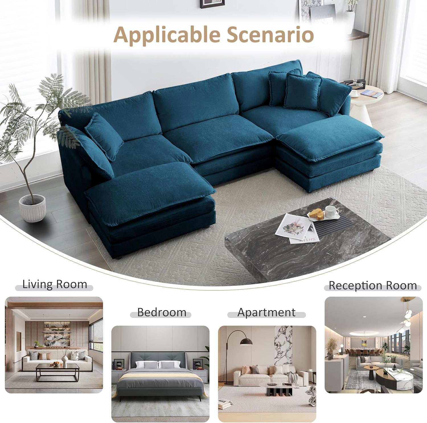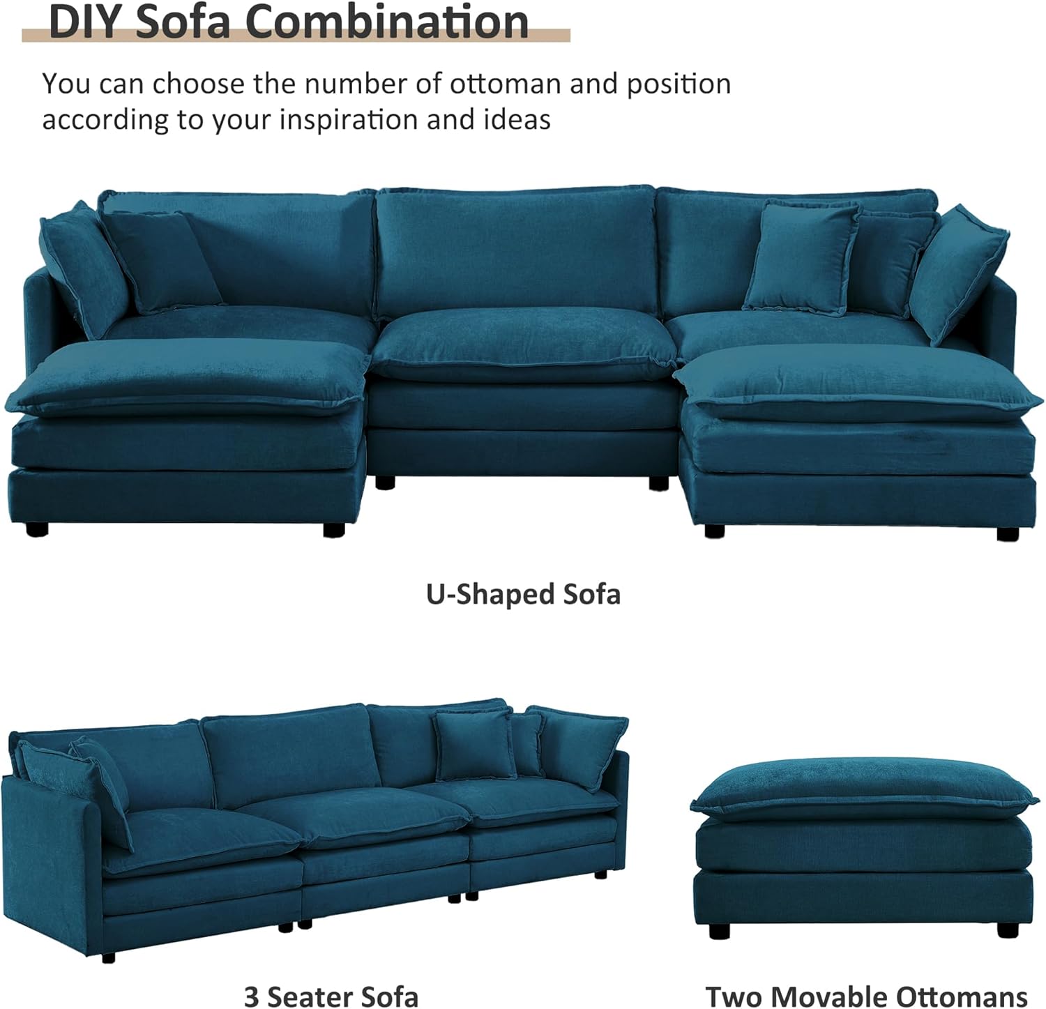 111.5" Oversized U-Shaped Modular Sectional Sofa Couch for Living Room, Modern Soft Chenille Large Cloud Couch, Comfy Deep Seat with Chaise & Movable Ottoman (Blue, U-Shaped 3 Seat)