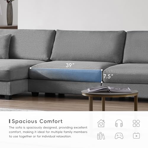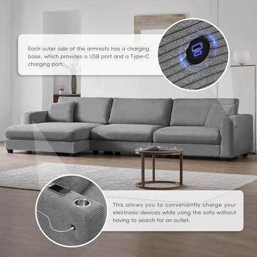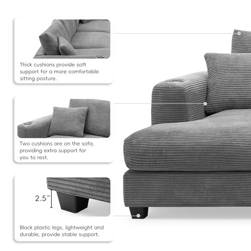 Oversized Corduroy Sectional Sofa, L Shaped Cloud Couch with USB Charging Port,Cup Holder,Deep Seat Sofa Bed with 50" Chaise, Comfy Indoor Furniture for Living Room Apartment (Beige)