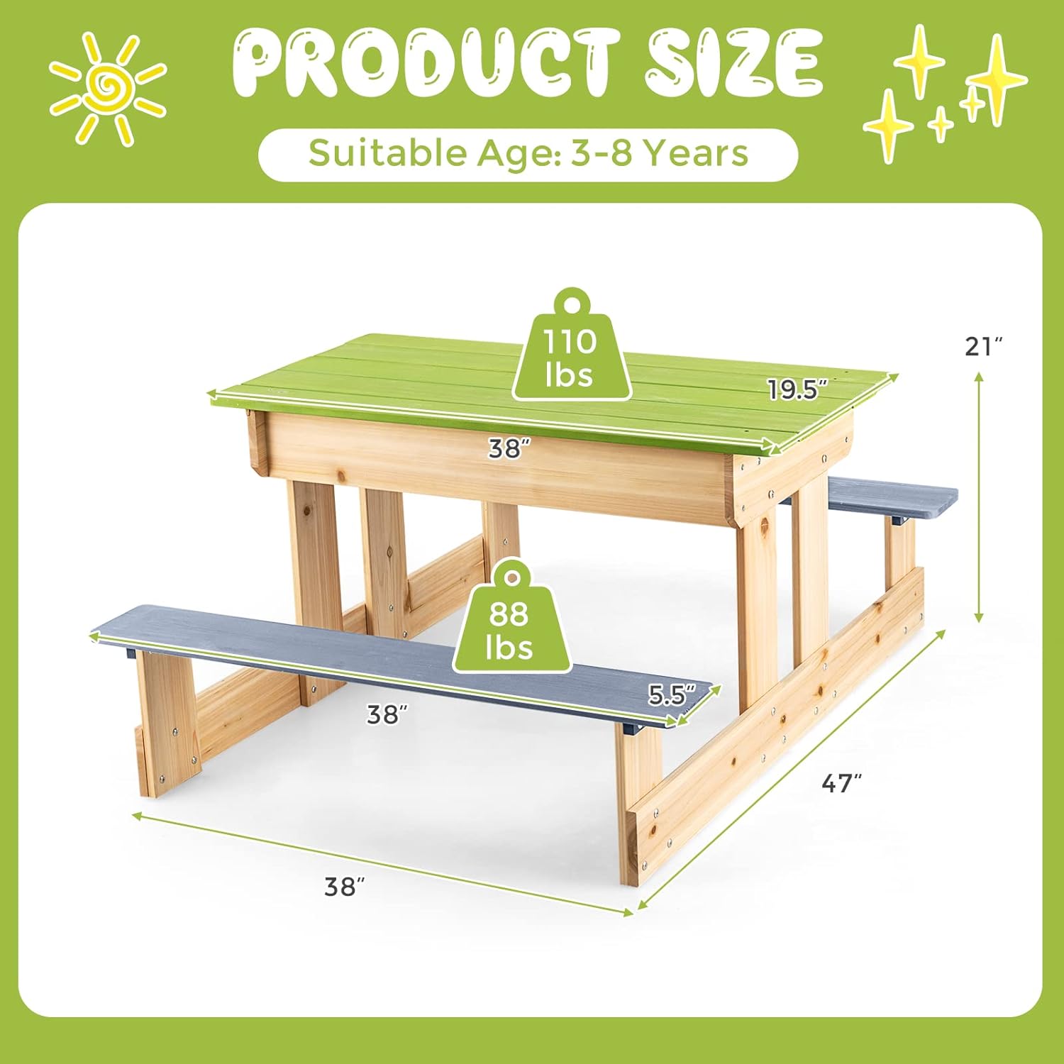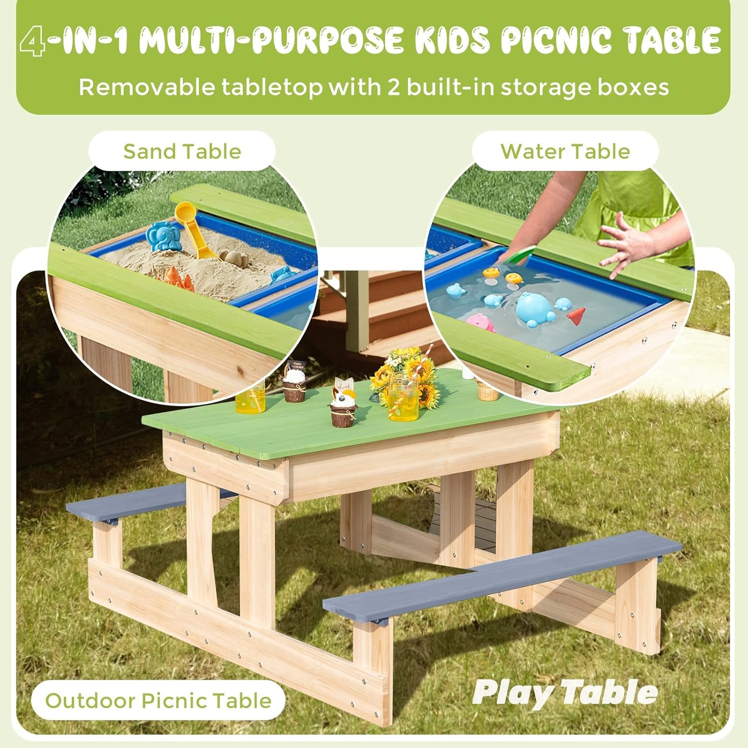 KOTEK Kids Picnic Table for Outdoors, 4 in 1 Wooden Sand and Water Table with Removable Tabletop & 2 Storage Bins, Indoor Activity Sensory Table and Chair Benches Set Art Play Table for Patio & Yard