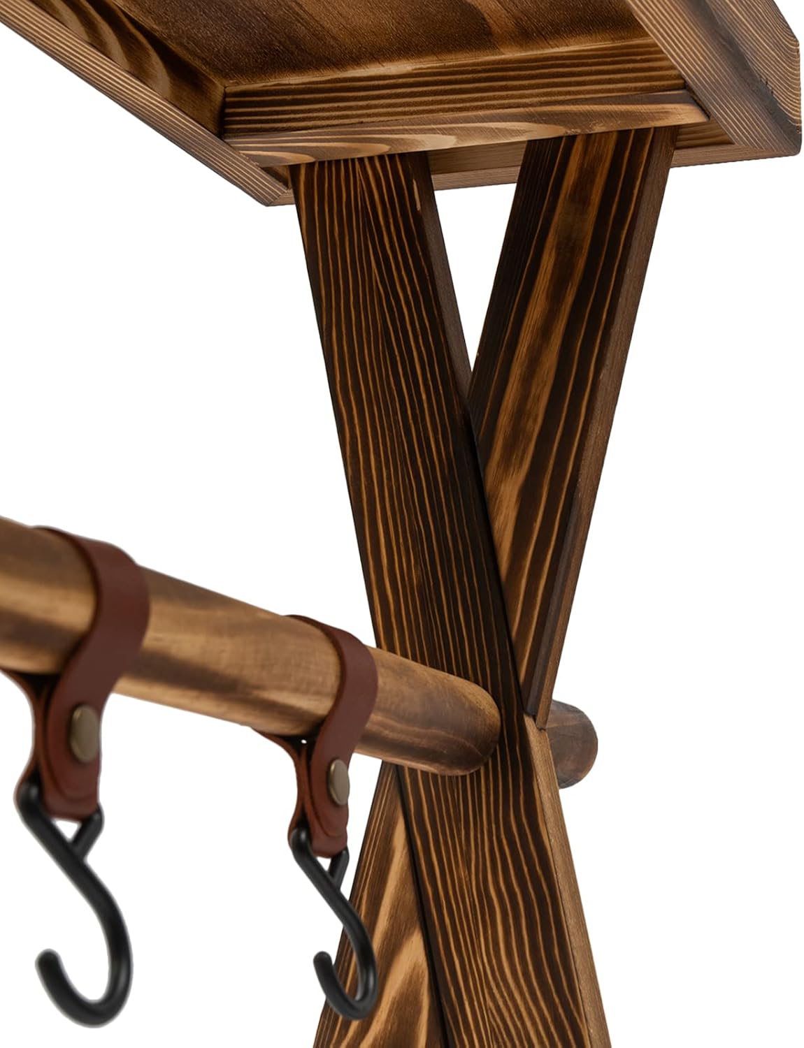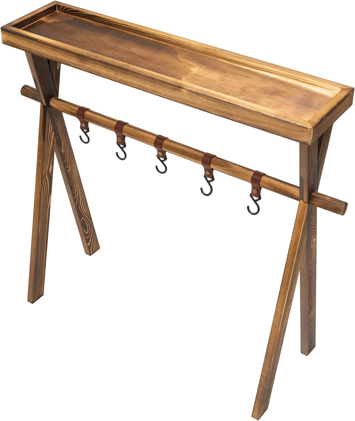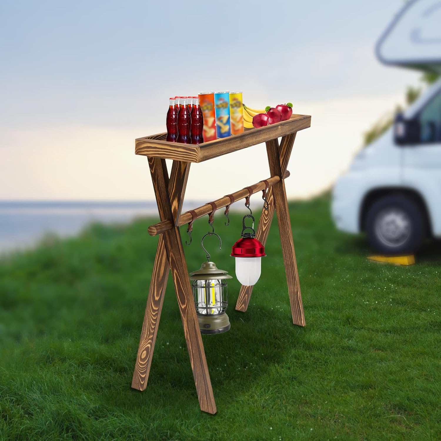 Wooden Portable Picnic Rack, Lightweight Beechwood Outdoor Picnic Table for Storage, Camping Tables with 5 hooks, Removable Storage BBQ Shelf for Picnic, Camping, BBQ, Home Storage