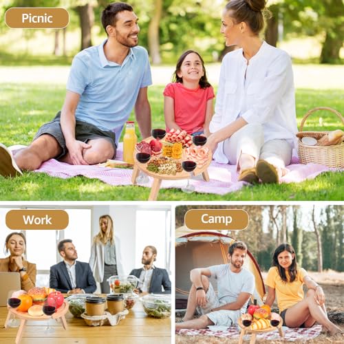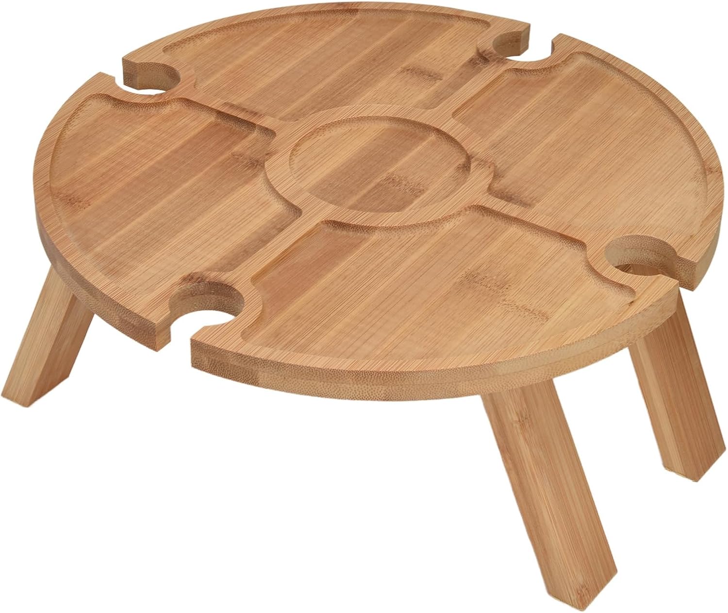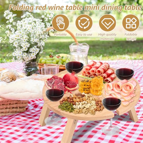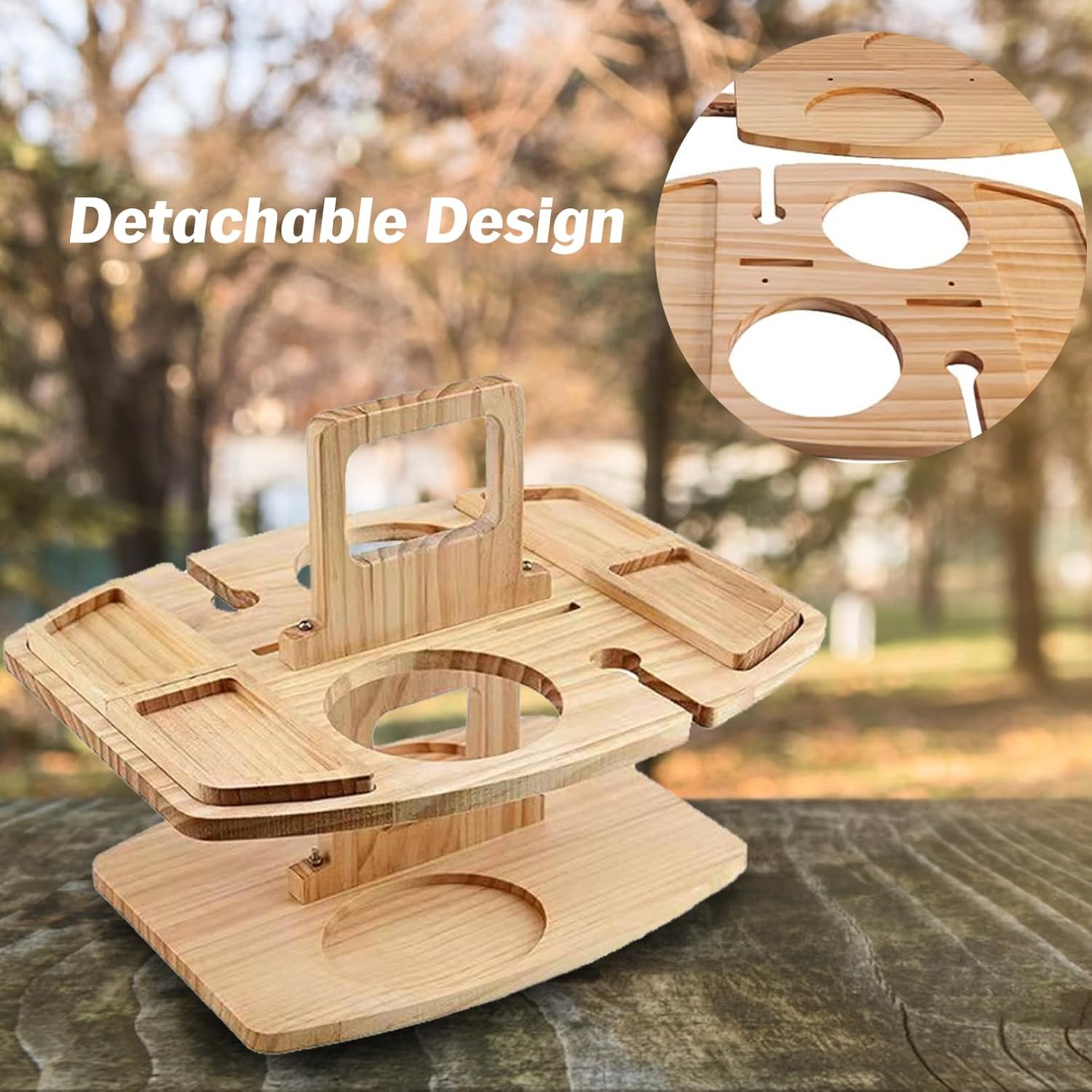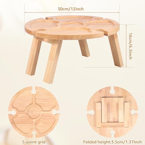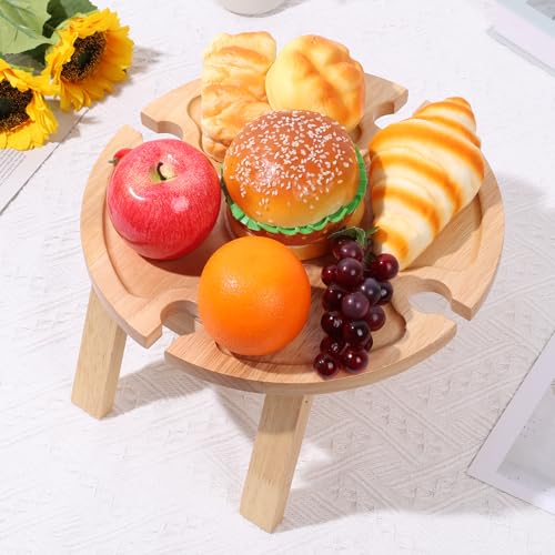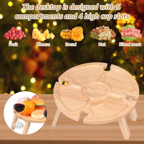 Folding Picnic Table with Wine Glass Holder, Portable Wine Table, 2 in 1 Portable Wine Glass Rack and Compartmental Dish Outdoor, Snack Tray Table for Cheese and Fruit, Camping, 11.8 in Diameter
