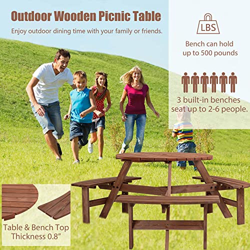 Wooden Outdoor Picnic Table with Umbrella Hole, Round Wood Dining Table with Benches for Patio Garden Backyard Lawn Commercial, Outside Table, 4 Built-in Benches, 2220lb Capacity, Natural