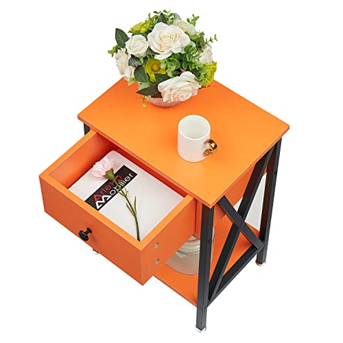 VECELO Nightstands Set of 2, Modern Bedside End Tables, Night Stands with Drawer and Storage Shelf for Living Room Bedroom, Industrial Metal Frame, Orange