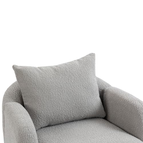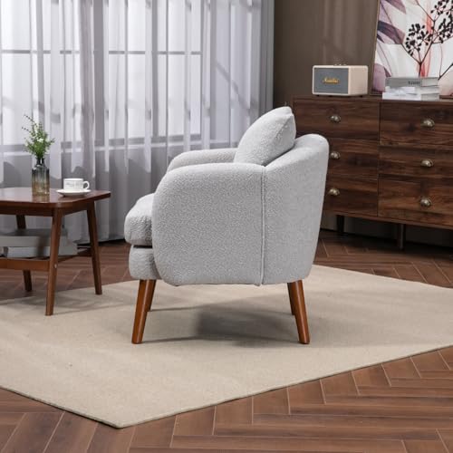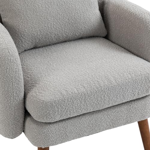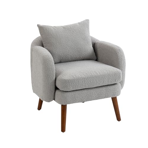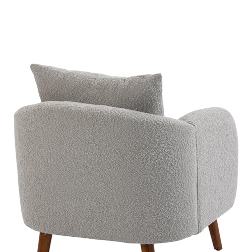 Modern Accent Chair, Round Comfy Armchair, with Pillow, Wood Legs, Teddy Boucle Upholstered Side Chair for Living Room, Bedroom, Club, Hotel, Office, Waiting Room, Grey