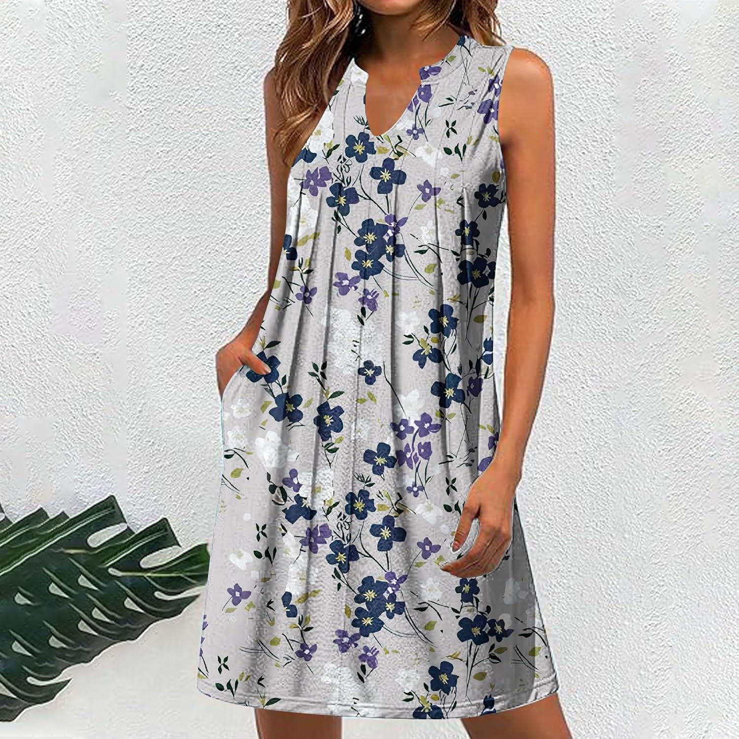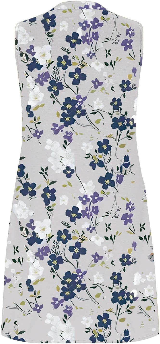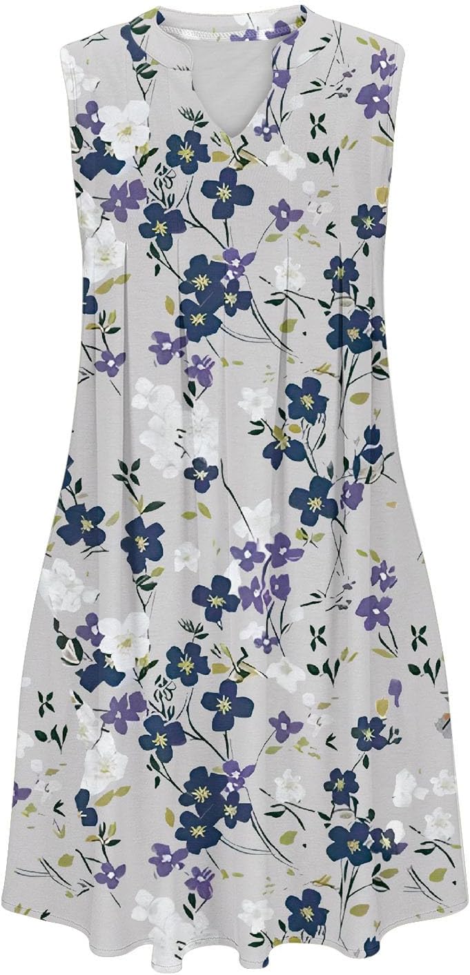 Women Casual A-Line Dress with Pockets 2024 Summer Sleeveless V Neck Tshirt Dress Loose Pleated Flowy Work Office Dress
