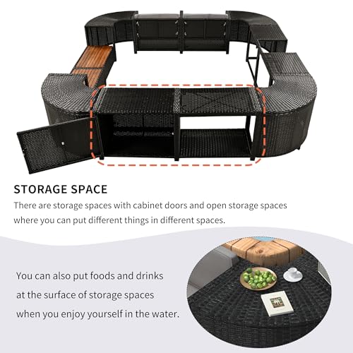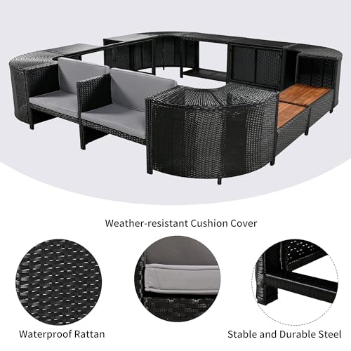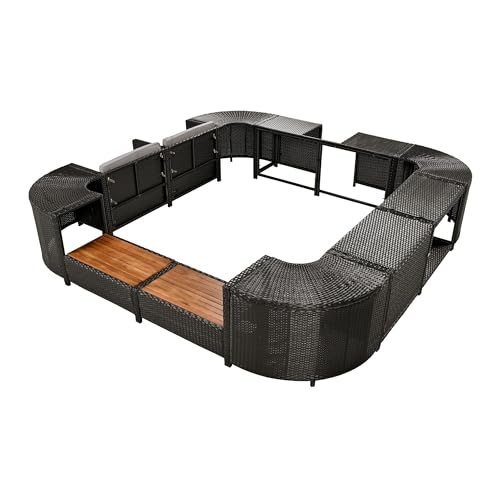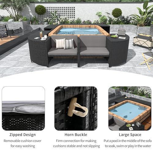 Versatile Spa Surround Patio Rattan Sectional Sofa Set with Removable Cushions,Wooden Seats,Built-in Storage,Weather-resistant for Poolside,Garden, Backyard - Suitable for 74” Portable Spa (Grey)