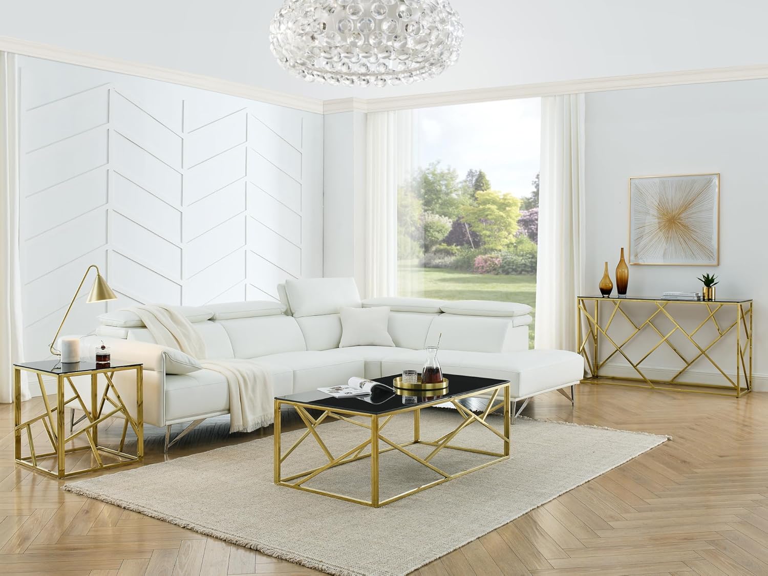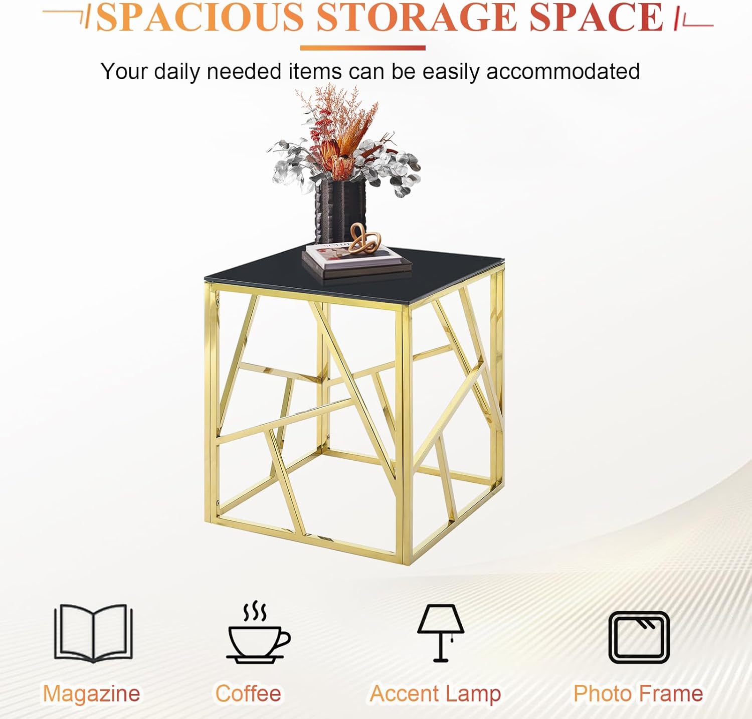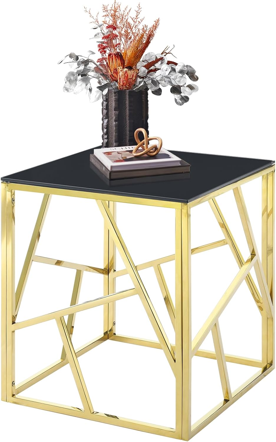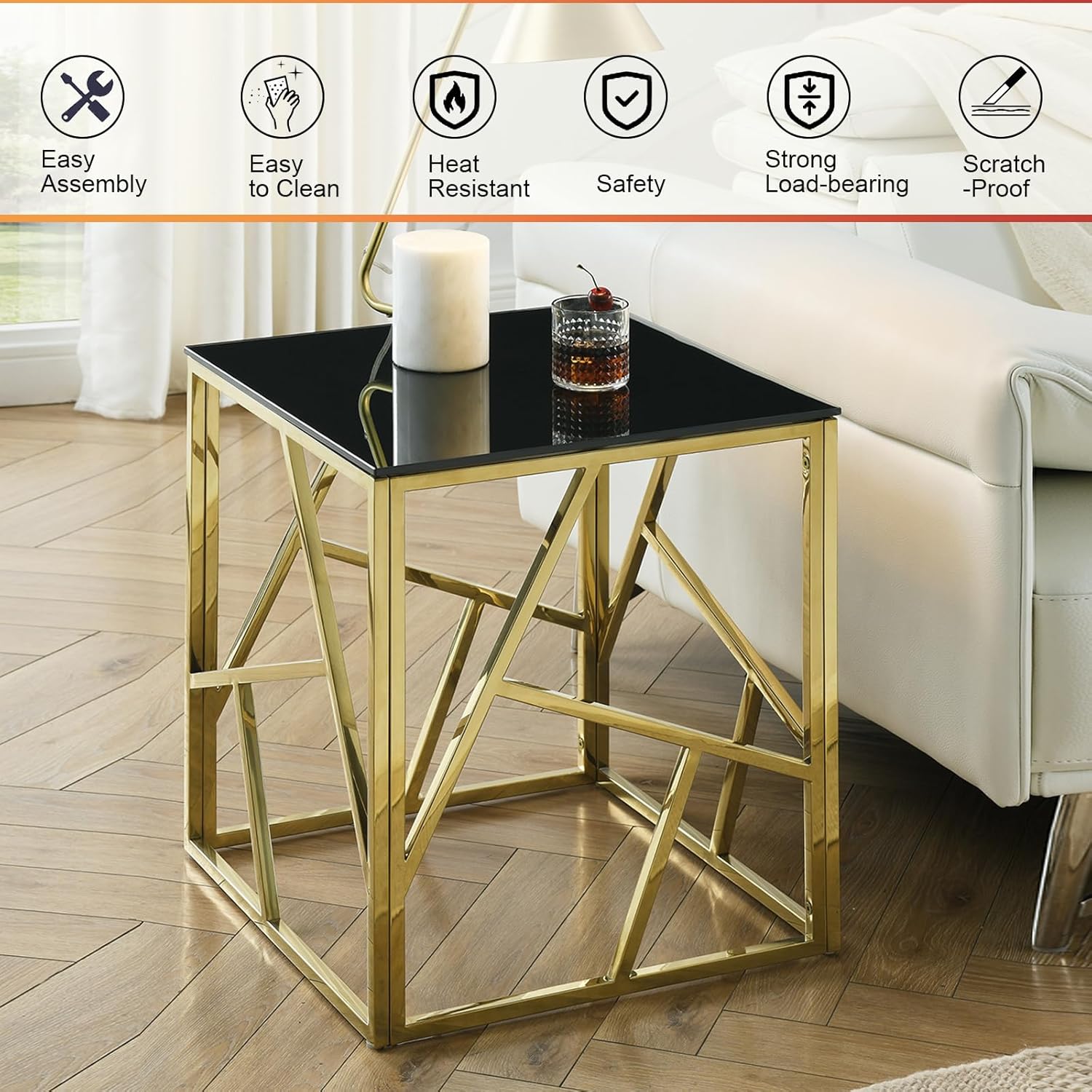 Pvillez Glass Side Table, Mid Century Modern Square Black Glass End Table with Gold Stainless Steel, Small Accent Sofa Side Table for Small Spaces, Bedroom Glass Bedside Table, Living Room End Table