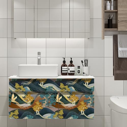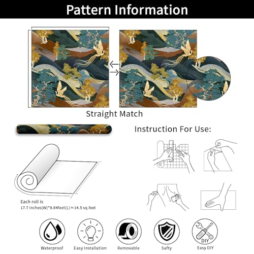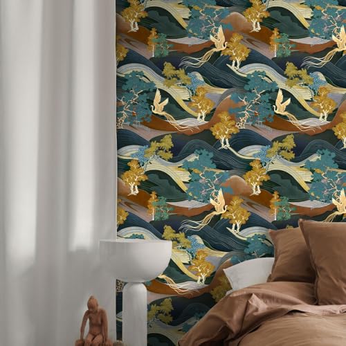 17.5"x118" 3D Abstract Mountain Wallpaper Yellow Blue Trees Gold Phoenix Wallpaper Self Adhesive Colorful Nature Landscape Contact Paper Wall Murals for Bedroom Living Room TV Sofa Background Home