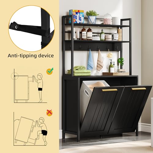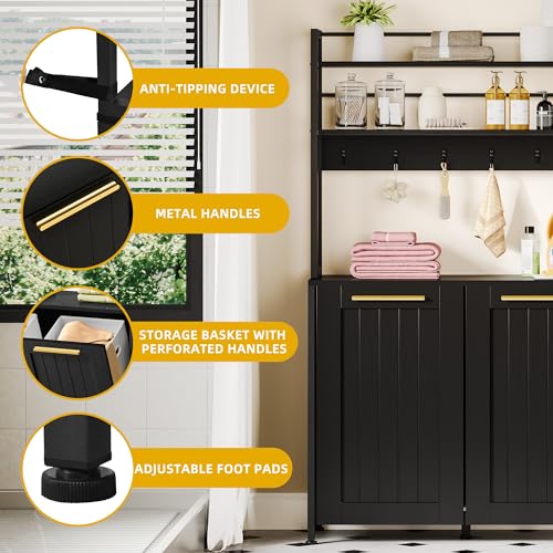 YITAHOME 53" Tilt Out Laundry Hamper - Bathroom Storage with Hamper 2 Removable Laundry Baskets, Laundry Hamper Cabinet with Shelves and Hooks for Laundry Room Bathroom, Black