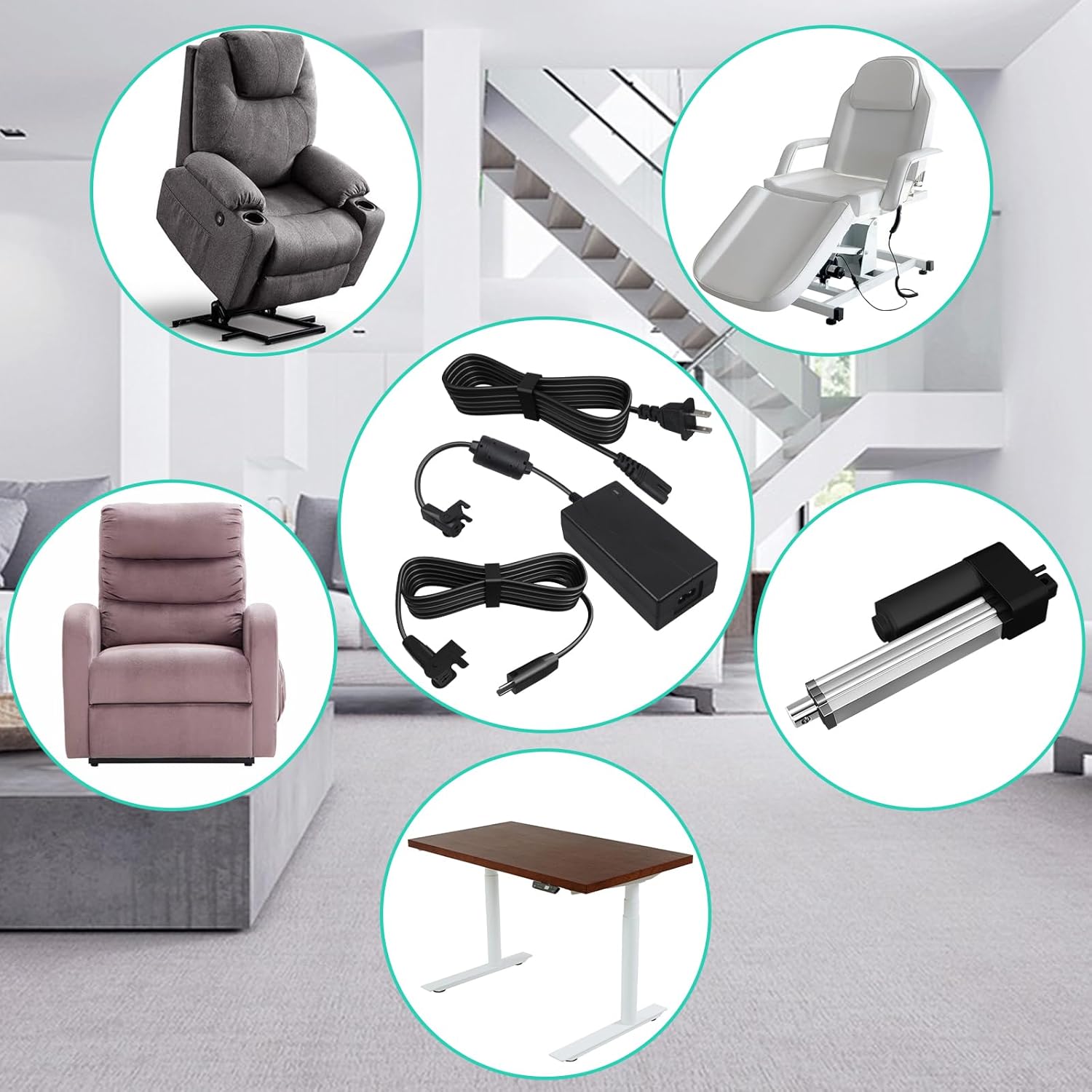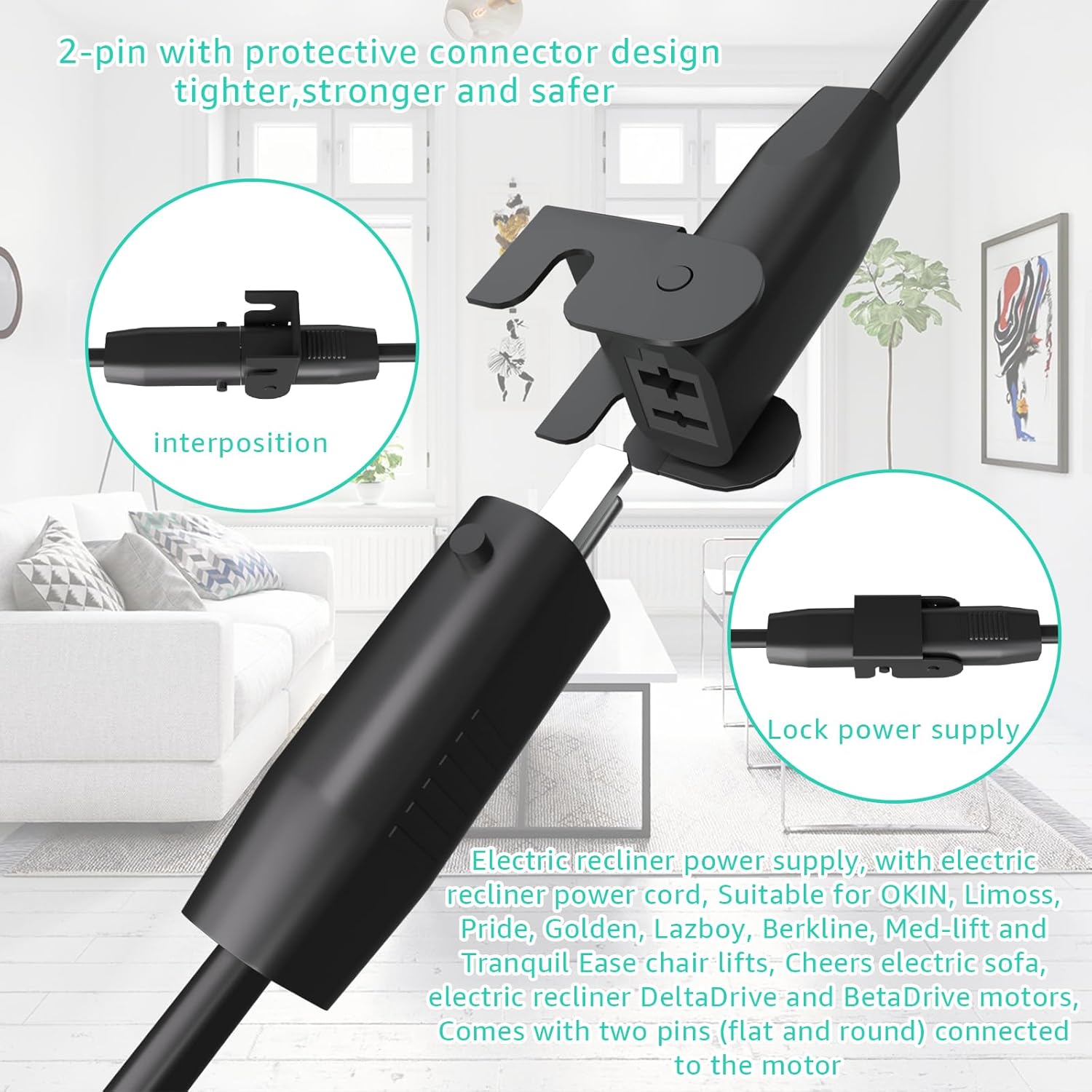 Recliner Power Supply Replacement Cord for Electric Couches and Recliners.2-Pin 29V2A Power Adapter with Extension Cord for Lift Chair, Recliner Sofa, Recliner Couch,Black