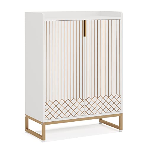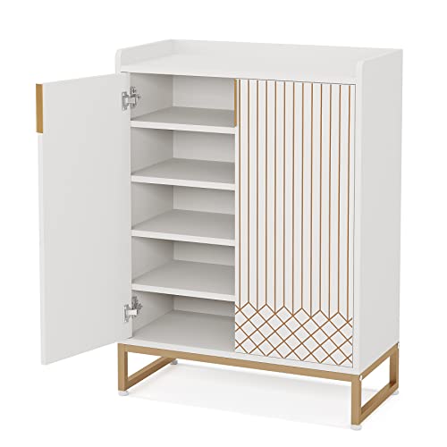 Tribesigns White, 25 Pair Shoe Cabinets with Doors, 5-Tier Modern Shoe Rack Organizer Cabinet, Freestanding Wood Storage Cabinet with Gold Metal Frame for Bedroom Hallway Living Room