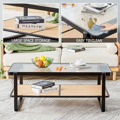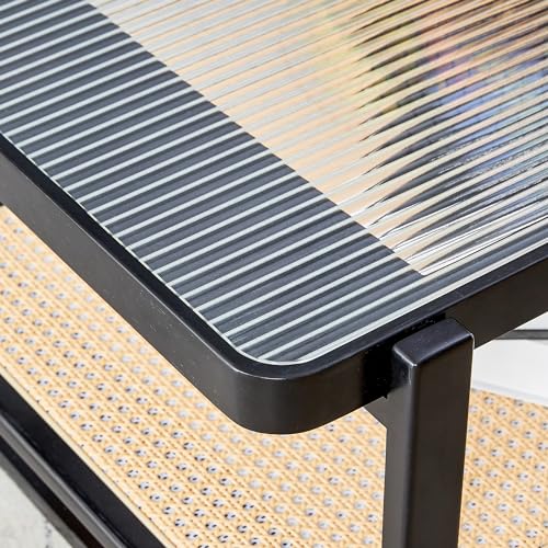Mid Century Modern Coffee Table with Ribbed Glass Top and PE Rattan Storage Shelf, 45 Inch Rectangular Solid Wood Boho Coffe Table, Unique Center Table for Livinig Room Apartment Small Space