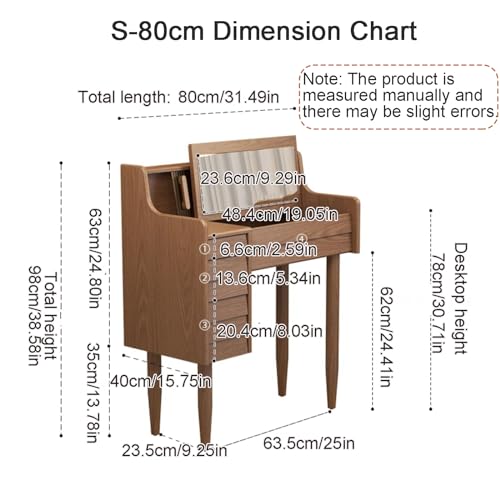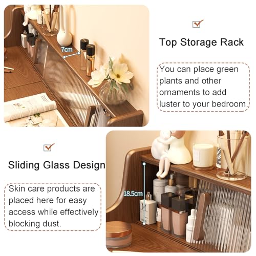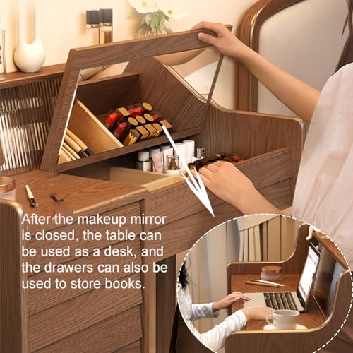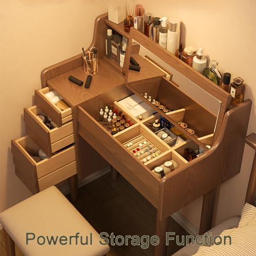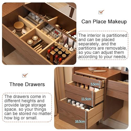 Makeup Vanity Desk with Flip Top Lighted Mirror and Chair, Solid Wood Vanity Table with Internal Storage Area, 3 Drawers, Bedroom Dressing Table (Walnut Color, M-100CM)