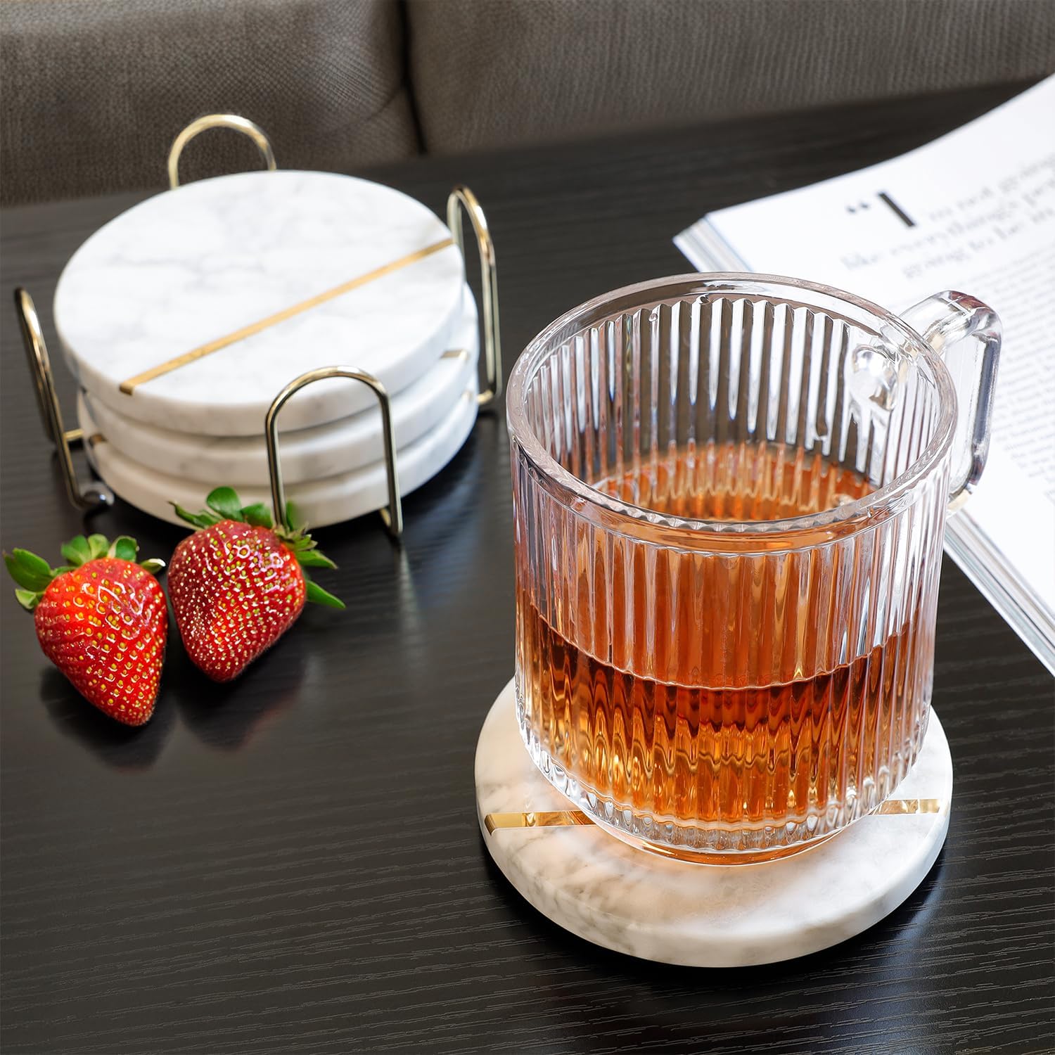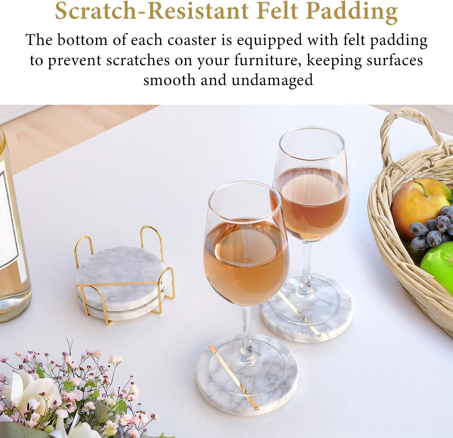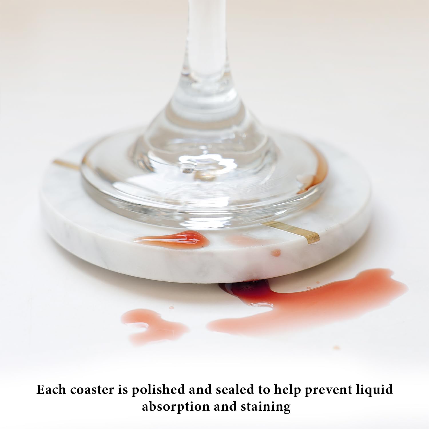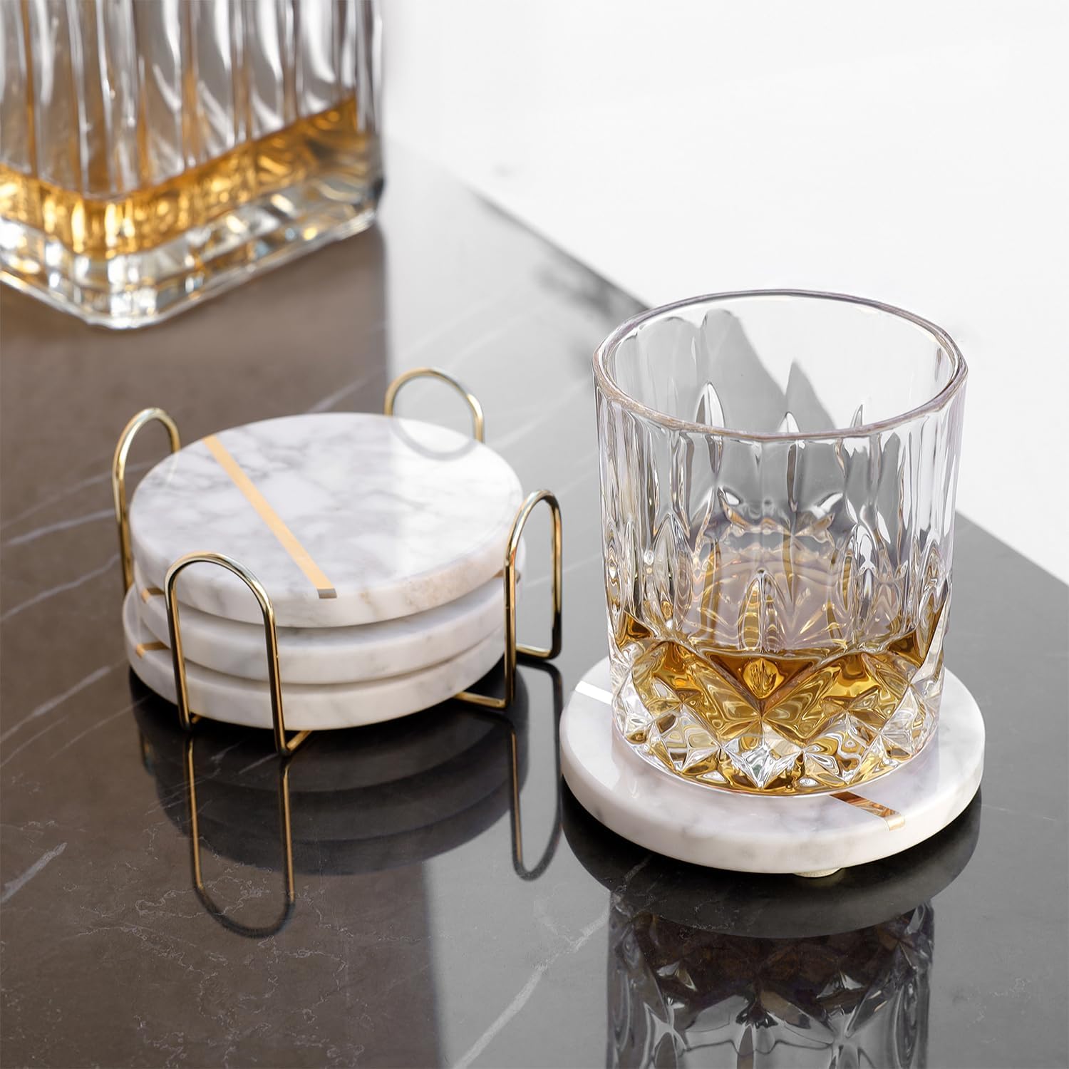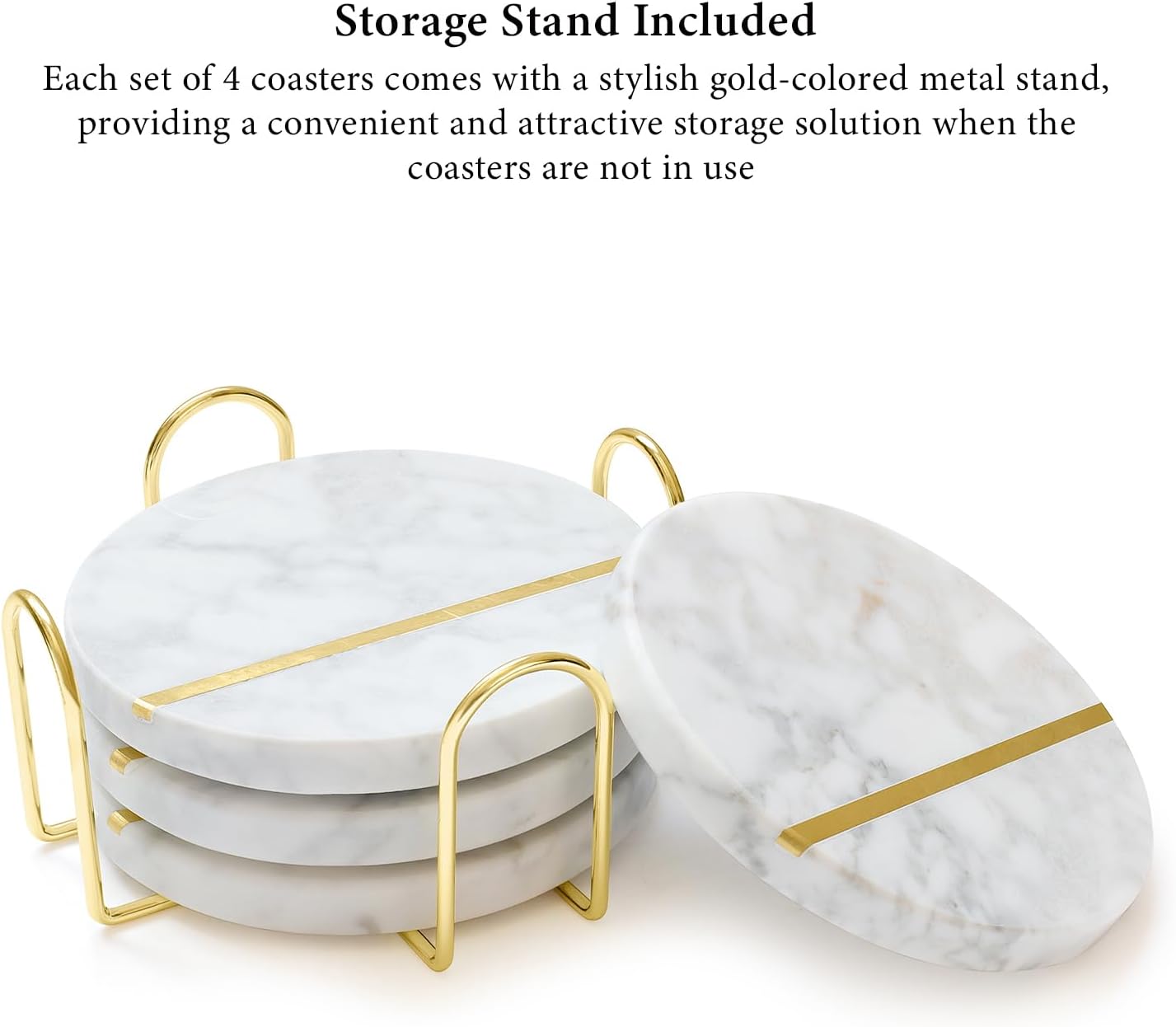 Natural White Polished Marble Coasters with Brass Inlay - includes Gold Colored Metal Stand/Holder - Non Slip Felt Padded - Sealed and Stain Resistant, Non Absorbent (Set of 4)