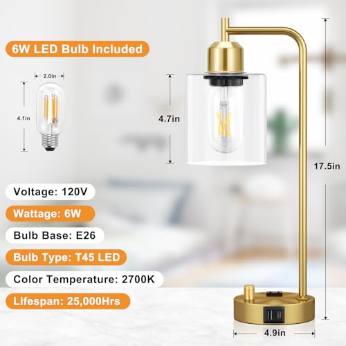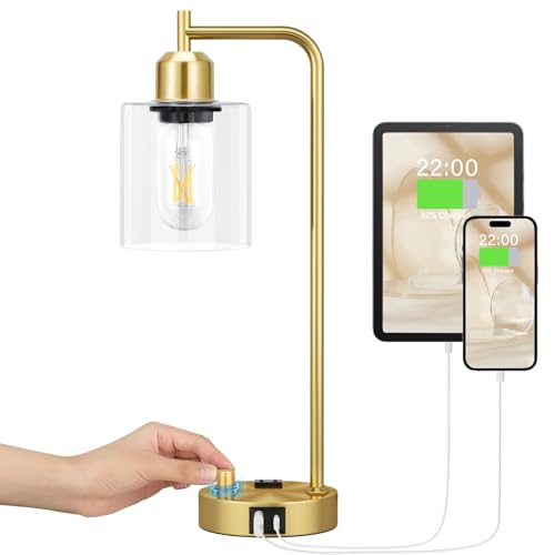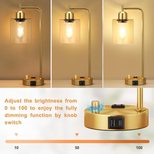 Innqoo Gold Lamp for Bedroom - Industrial Bedside Table Lamp with USB Port and Outlet, Fully Dimmable Nightstand Lamp with Opal Glass Shade, Small Desk Lamps for Home Office