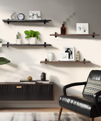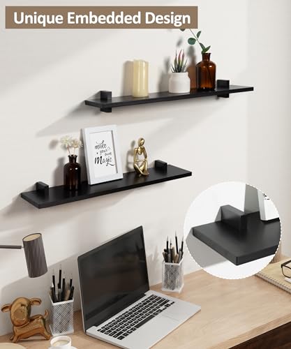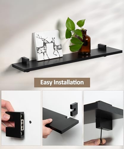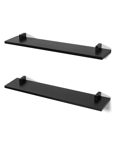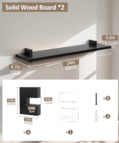 Gronda Black Floating Shelves for Wall 24 Inch Wall Mounted Wood Shelf Set of 2, Pine Solid Wood Modern Decor Shelf for Bedroom, Kitchen, Office, Living Room