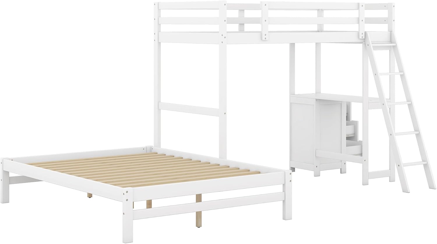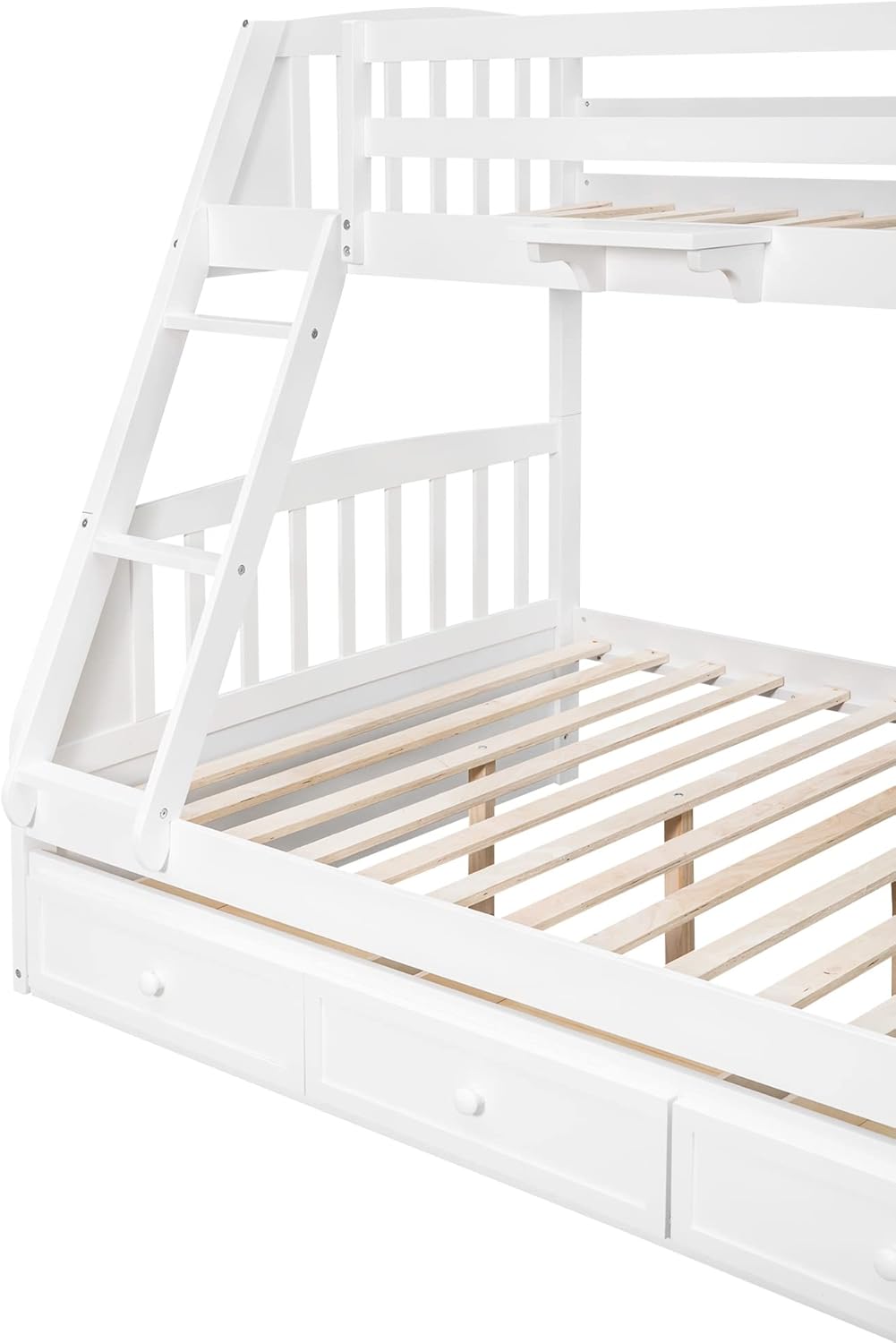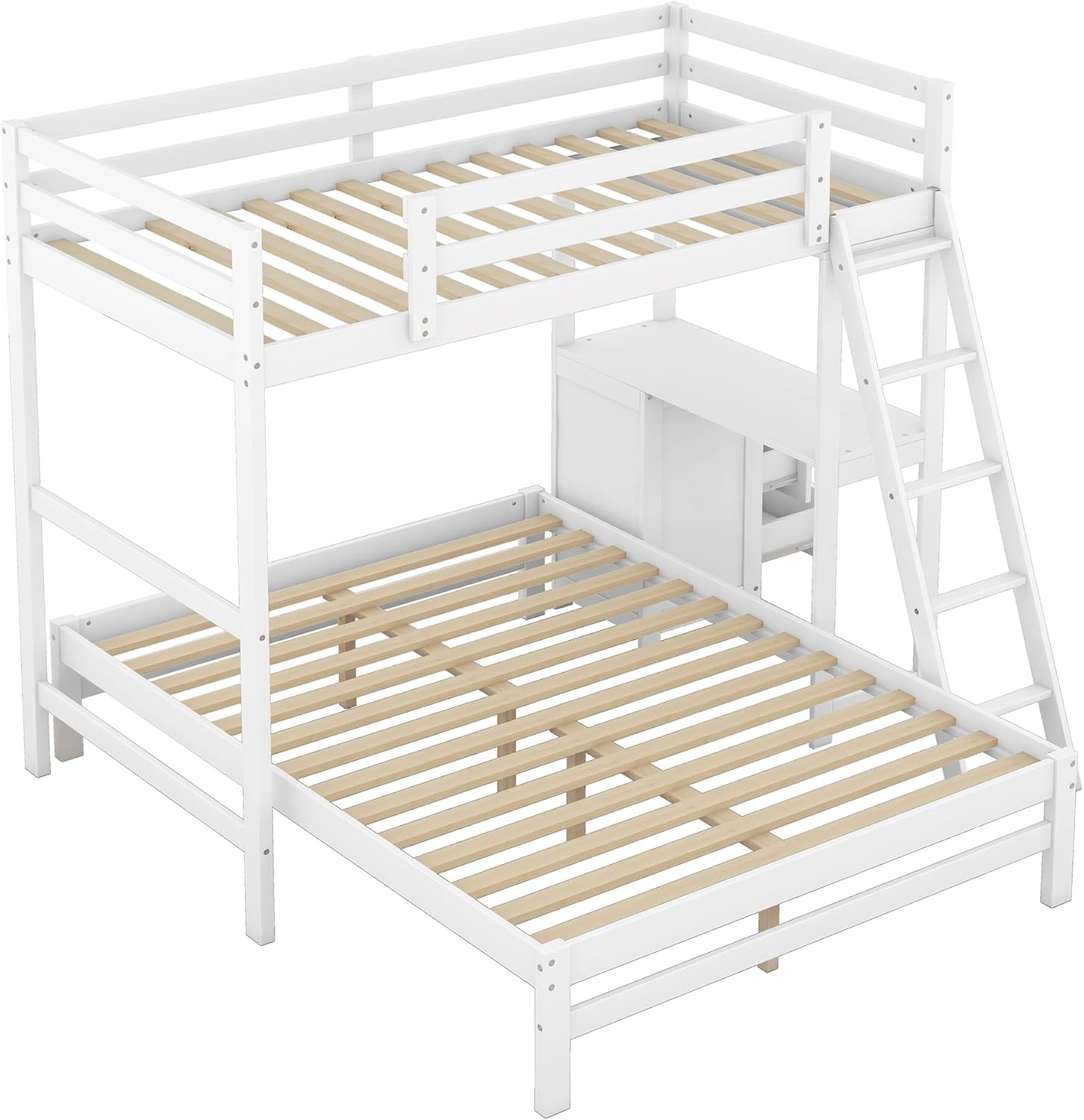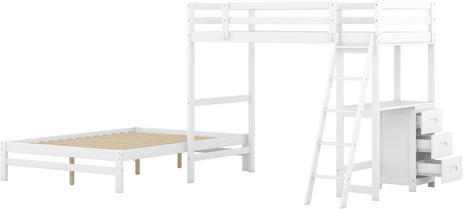 Twin Over Full Wooden Bunk Bed with Built-in Desk and 3 Drawers, L-Shaped Loft Bunk Bed with Removable Bottom Bed for Kids Girls Boys Teens, White