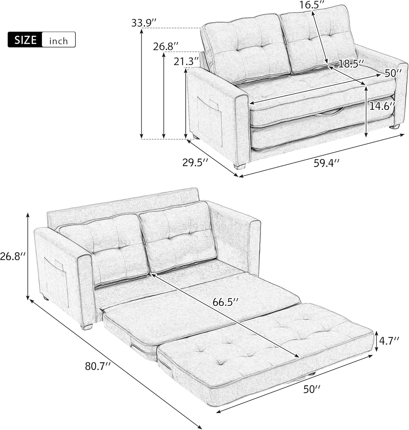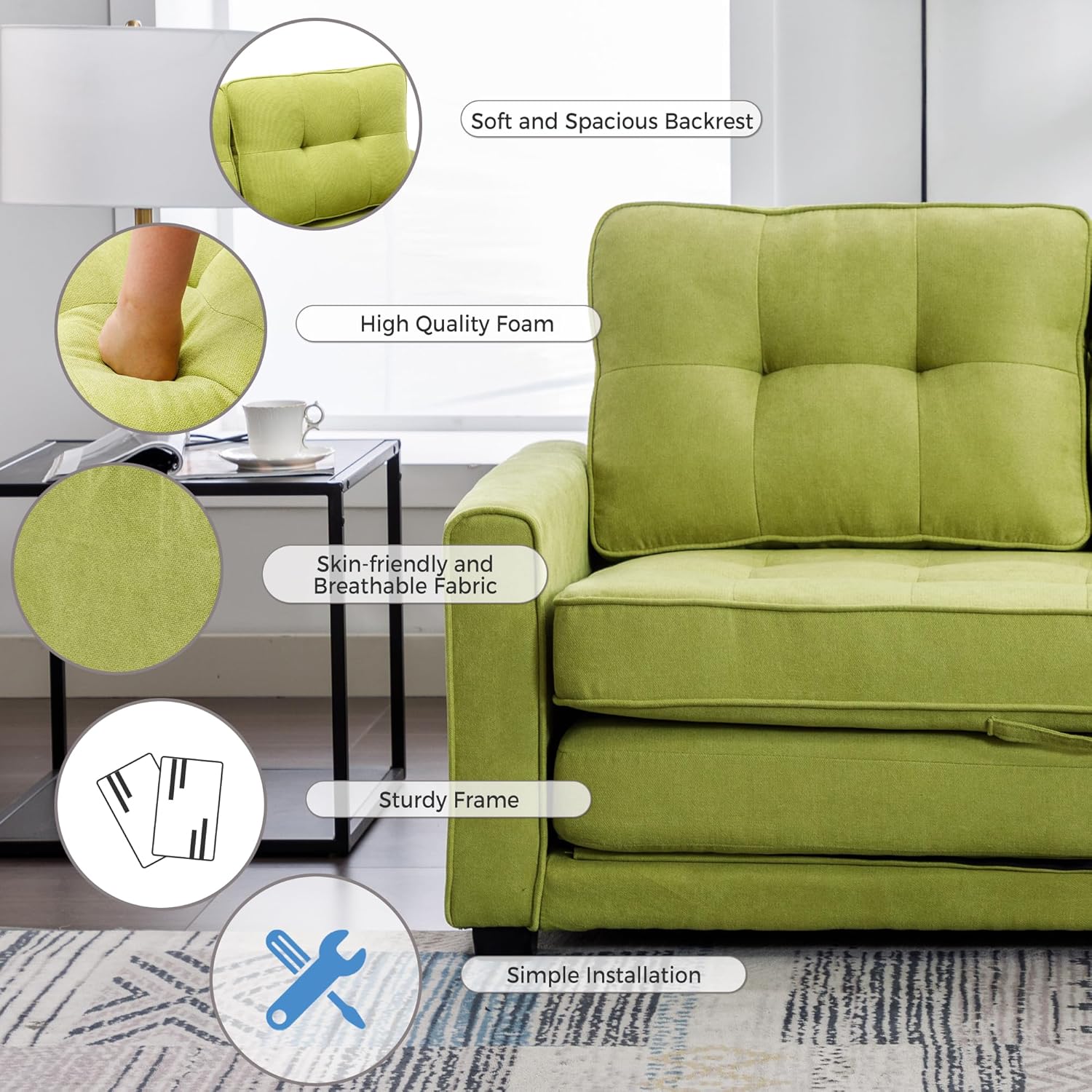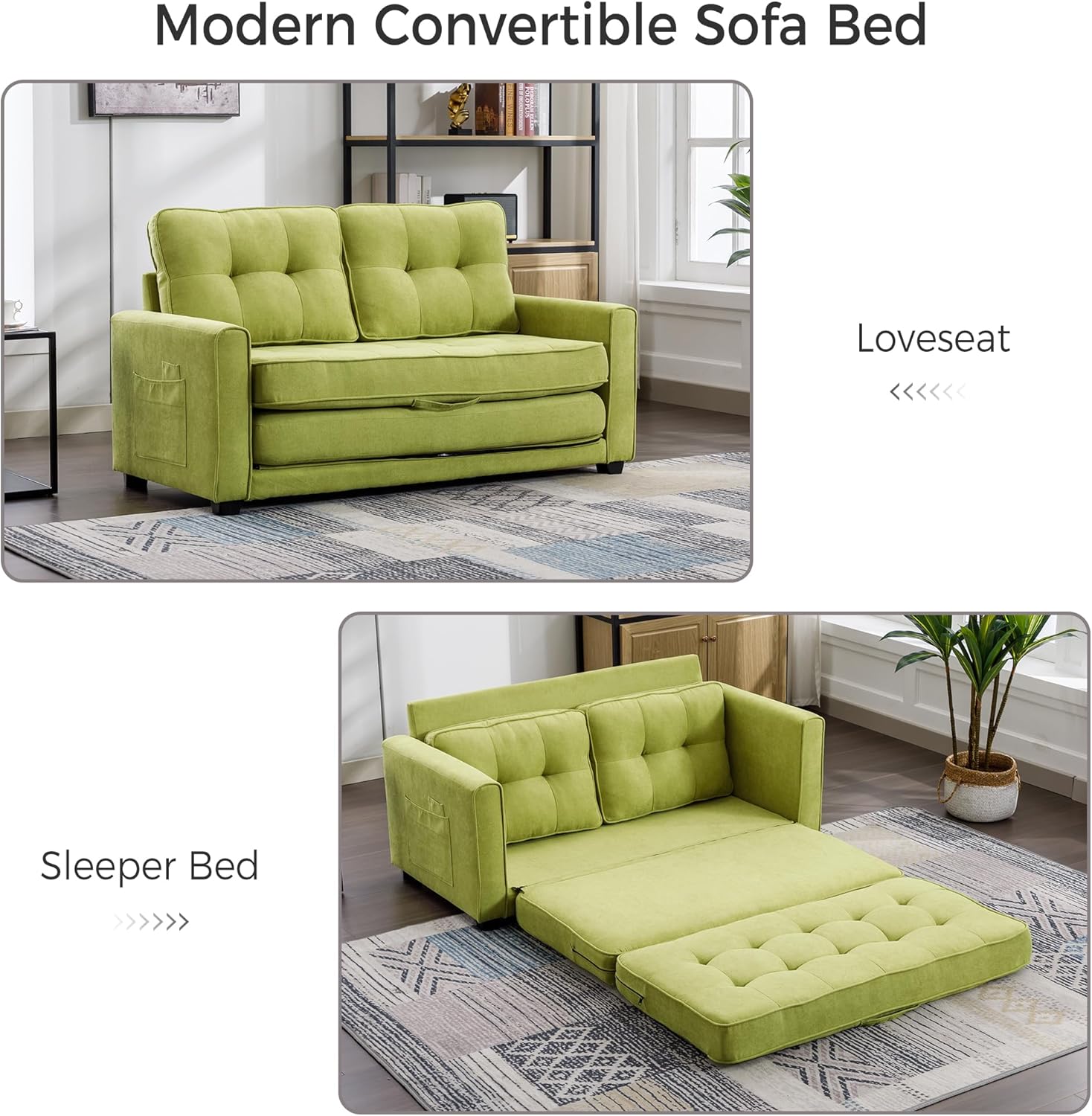 59.4" Loveseat Sofa with Pull-Out Bed Modern Upholstered Couch with Side Pocket for Living Room Office, Green