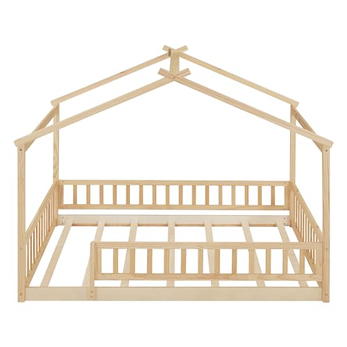 Merax Full Size Wooden House Bed with Two Drawers, Wood Bed Frame with Roof for Kids, Teens, Boys or Girls, Natural
