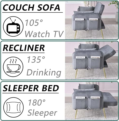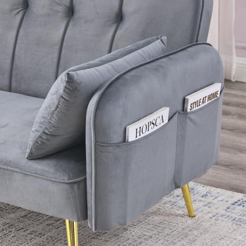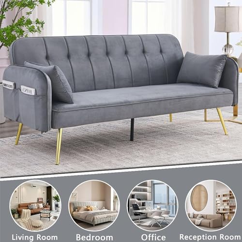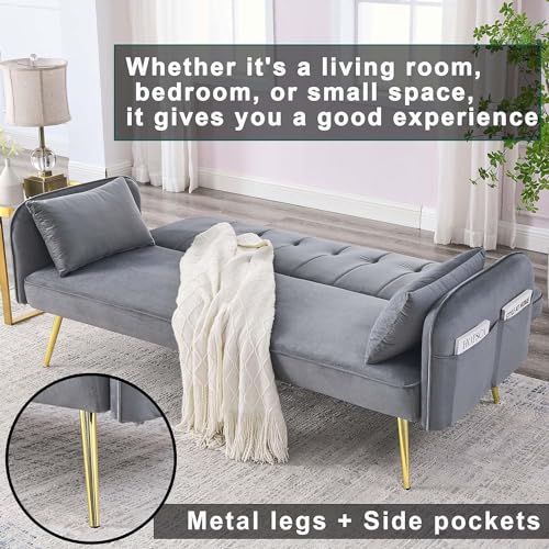 72.5" Convertible Folding Sofa Bed Futon,Mid-Century Velvet Love Seat Sofa,Upholstered Sleeper Couch with 2 Pillows&Golden Metal Legs for Small Space Living Room Apartment Office (Green)