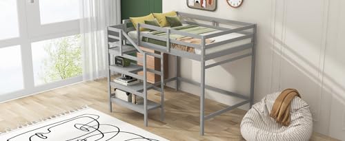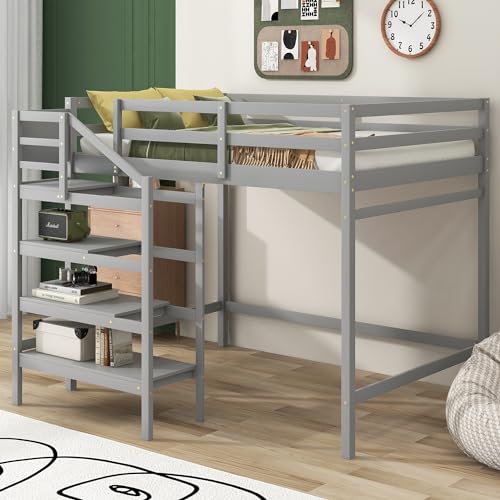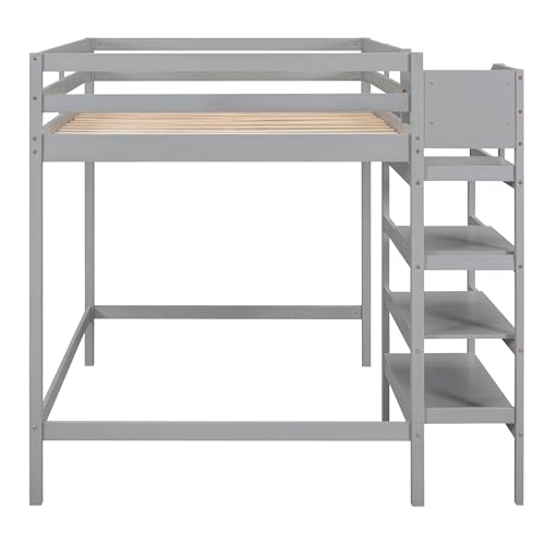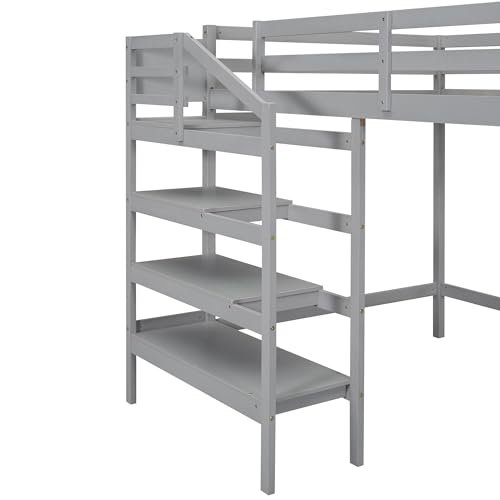 Full Size Loft Bed with Storage Staircase and Hanger,Wooden Loft Bed Frame with Storage Shelves and Safety Guardrail for Kids Teens Adults,Bedroom(White)